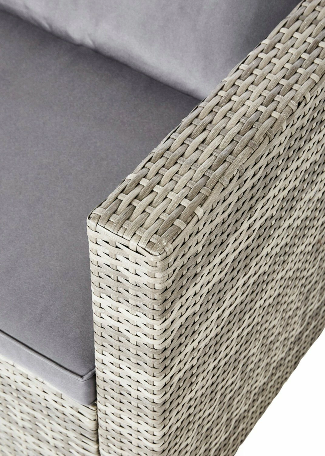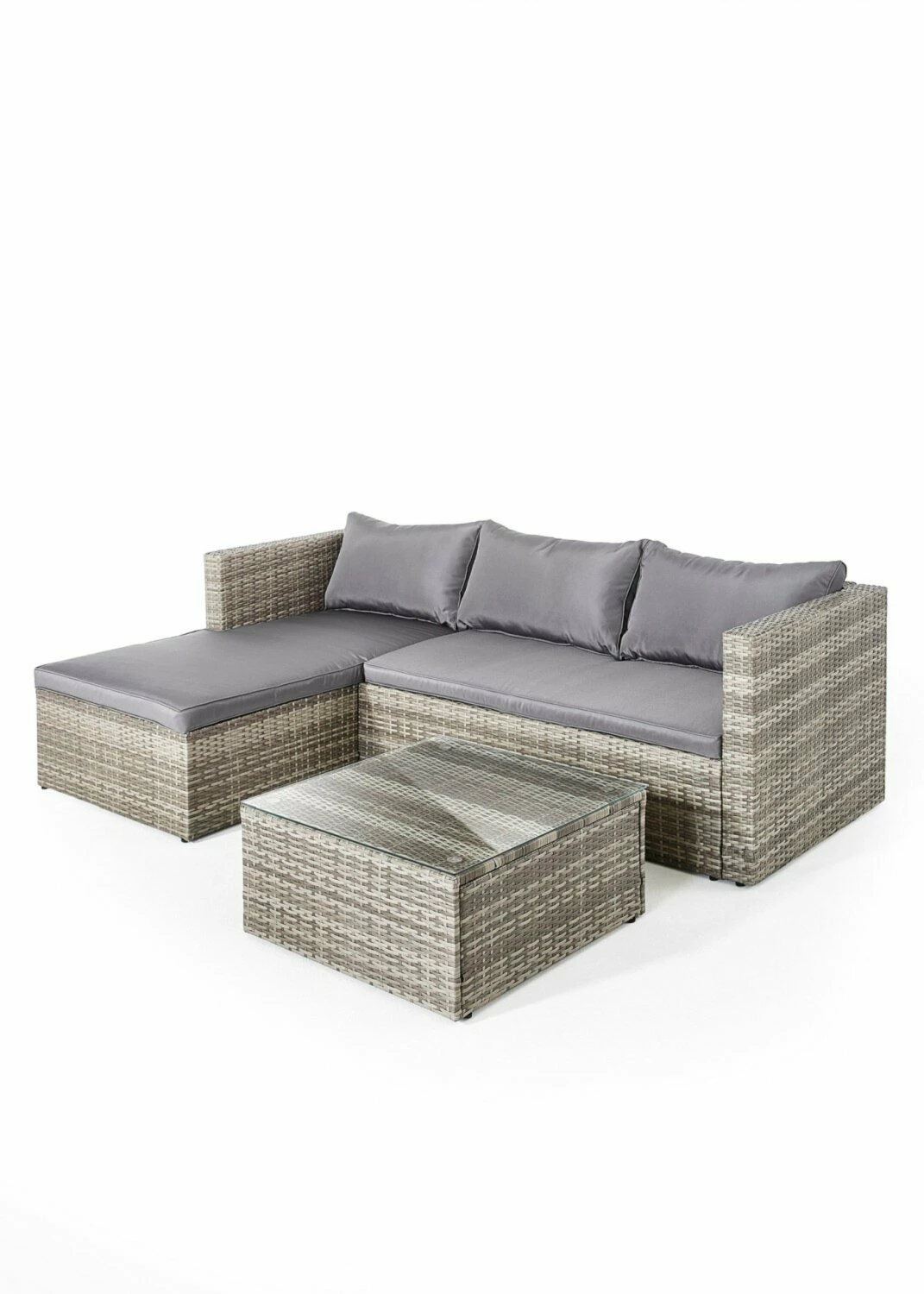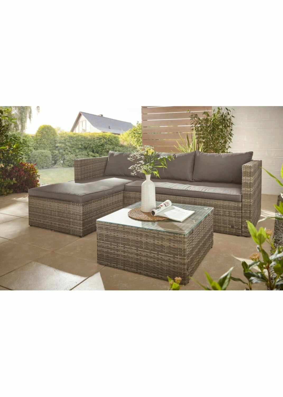 Dieses 2-teilige Gartenmöbel-Set in Grau besteht aus zwei Couchelementen und einem Couchtisch. Der Couchtisch ist mit einer Glasscheibe ausgestattet. Dadurch haben Sie eine spiegelglatte Oberfläche für Ihre Drinks oder Lieblingsromane. Beim Kauf des Sets werden Sitz- und Rückenkissen mitgeliefert. Dies ermöglicht einen sofortigen komfortablen Genuss des Wetters in Ihrem Garten.