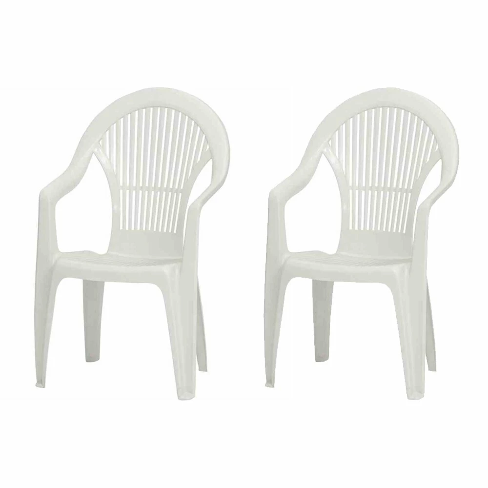 Zwei stapelbare Gartenstühle in Weiß aus Kunststoff. Das Monobloc-Design zeichnet sich durch seinen hohen Rücken und die dortigen Lüftungsschlitze aus – ein echter Klassiker in jedem Außenbereich. Zudem sind die Stühle kälte- sowie UV-beständig. Holen Sie sich diese Stapelsessel für Ihren Garten oder Balkon und genießen die Zeit im Freien!