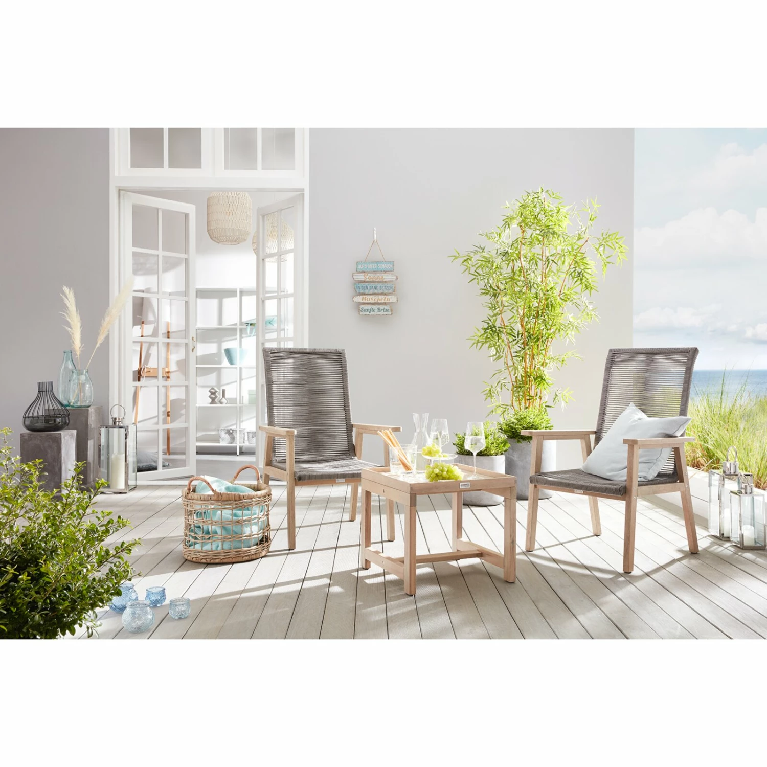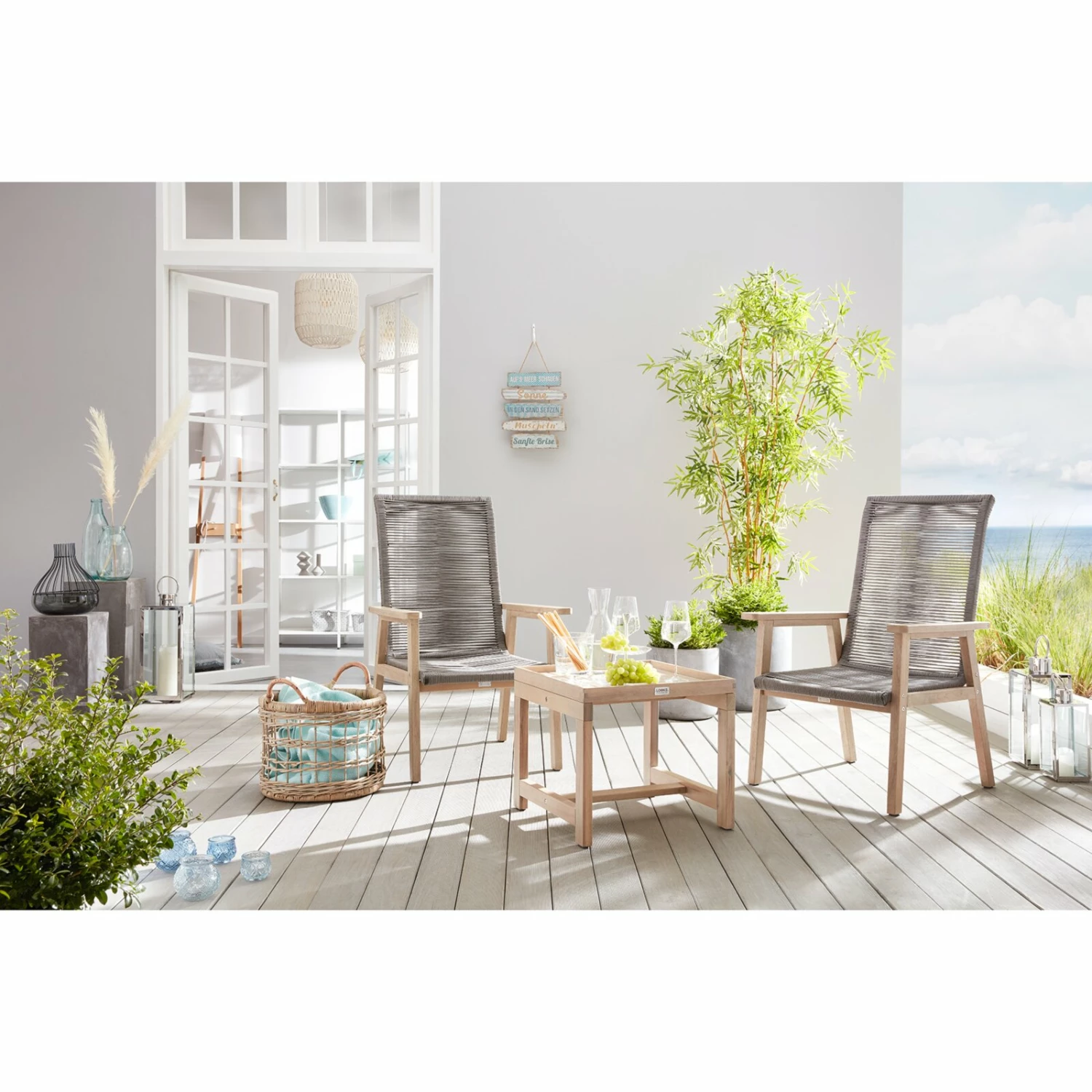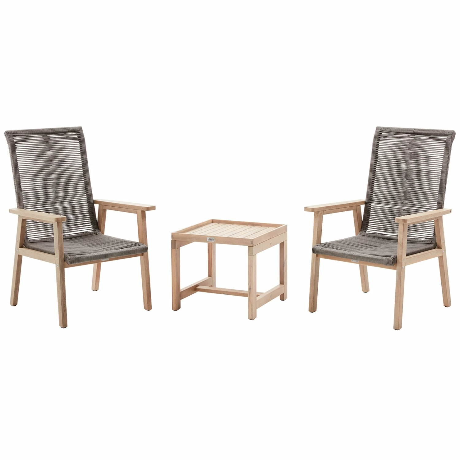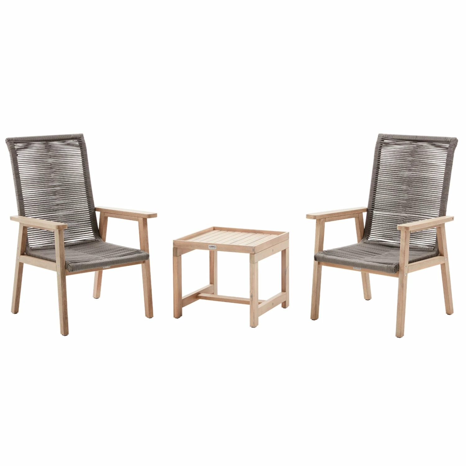 Dieses dreiteilige Lounge-Set besteht aus zwei Stühlen und einem Beistelltisch mit einem abnehmbaren Tablett. Aus Akazien Massivholz gefertigt, sind die Gartenstühle sowie der Tisch sehr stabil und robust. Die Rope-Sitzfläche macht die Stühle outdoorgeeignet. Genießen Sie ein gutes Buch oder ein leckeres Getränk mit diesem Lounge-Set. Das schlichte Design fügt sich in jeden Außenbereich ein.