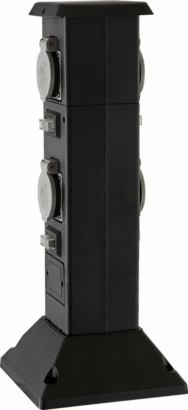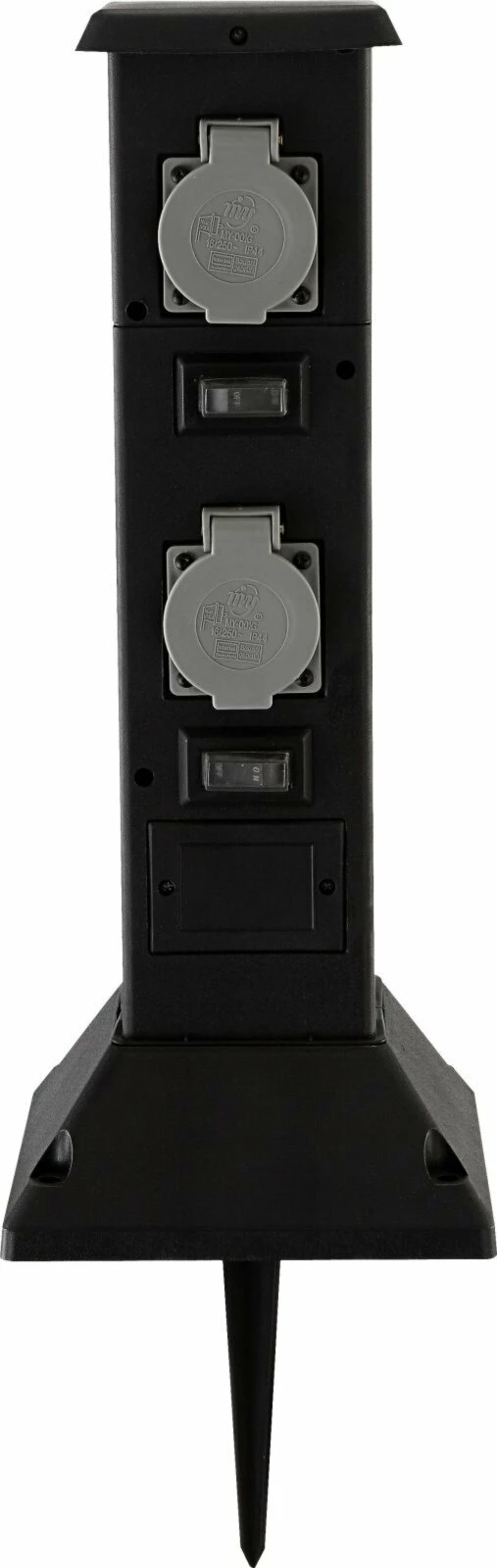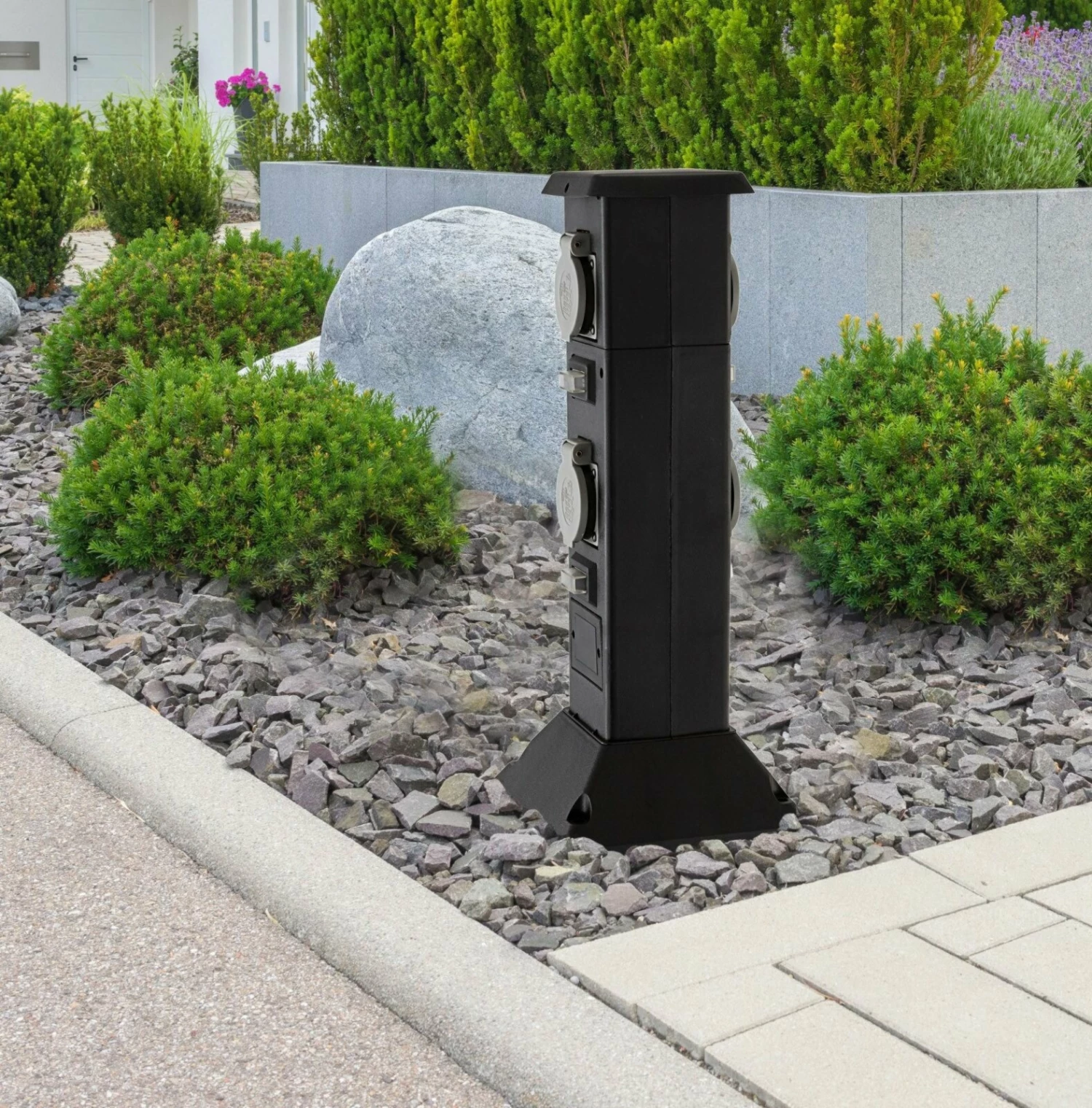 Super praktisch für den Außenbereich. Die Verteilersteckdose ist schwarz und das Gehäuse ist aus Kunststoff. Diese kann durch einen Stab am unteren Ende gut im Boden befestigt werden. Vier Steckdosen befinden sich hier und helfen bei langen Abenden auf der Terrasse den benötigten Strom für Musik und Co. zu spenden.