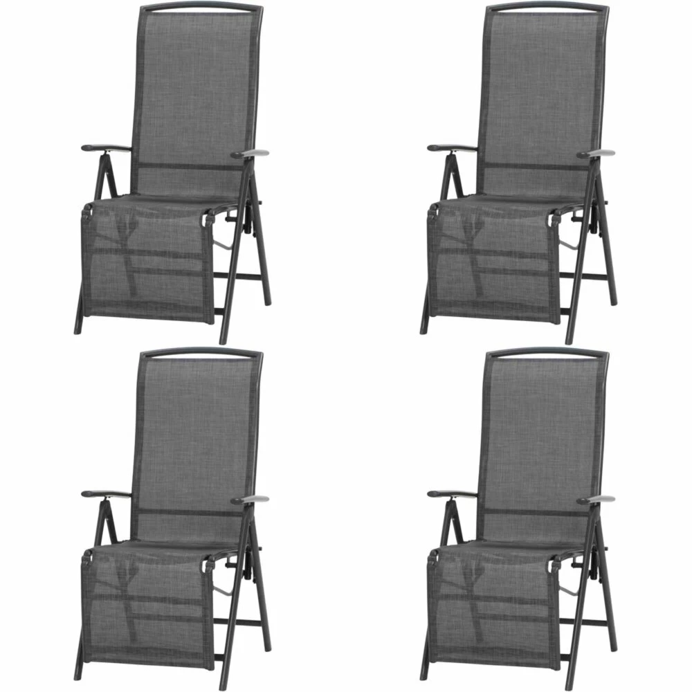 Vierteiliges Set Relaxstühle aus einem Aluminium-Gestell und Kunststoffgewebe. Das optische Highlight dieser Stühle ist die Bespannung in Silber-Schwarz. Durch die schlichte und moderne Farbgebung passen die Stühle gut zu anderen Gartenmöbeln und fügen sich so hervorragend in jeden Außenbereich. Machen Sie es sich im Freien bequem!