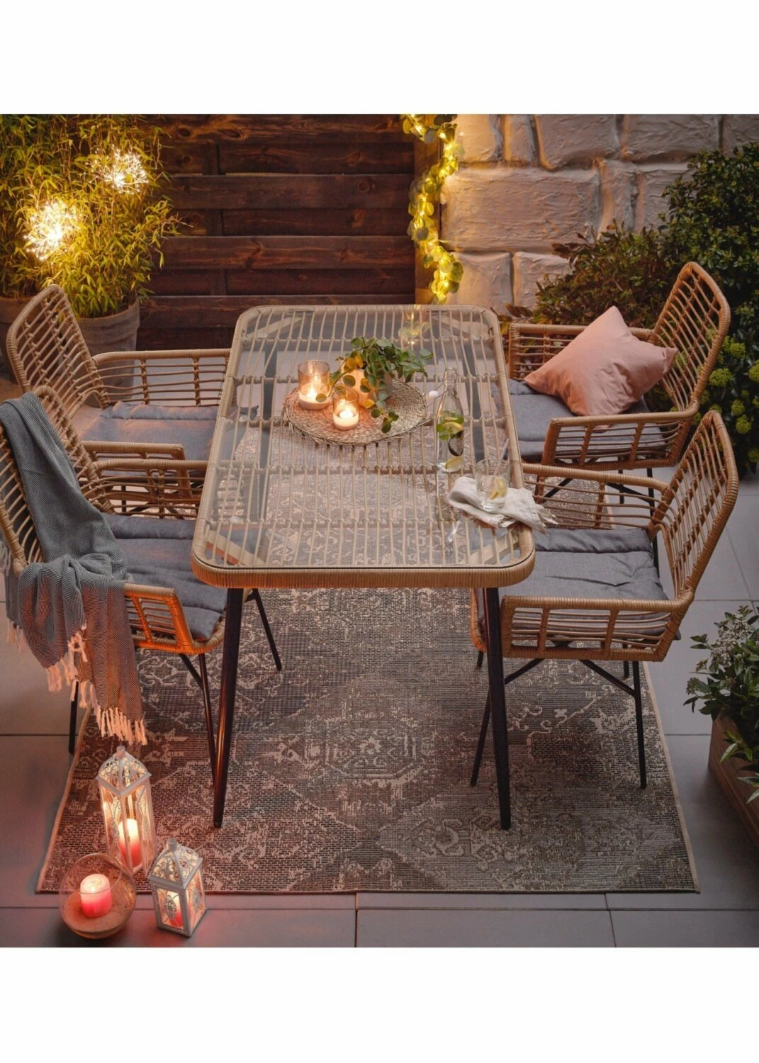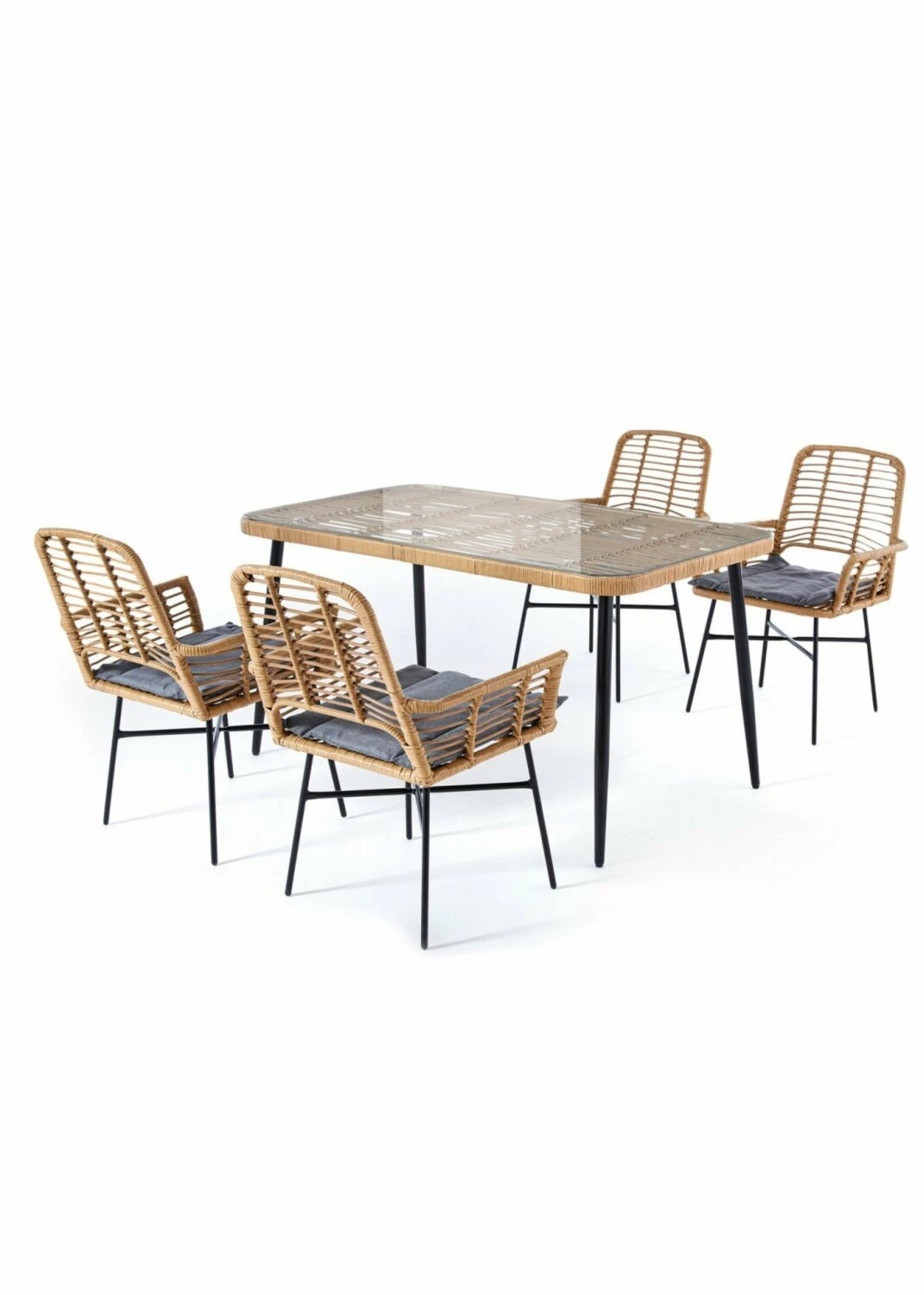 Diese 5-Teilige Tischgruppe sorgt durch ihr markantes Design und ihre sommerliche Leichtigkeit für Gemütlichkeit. Diese Sitzgruppe ist ideal für Ihren Garten, dem Balkon oder der Terrasse.