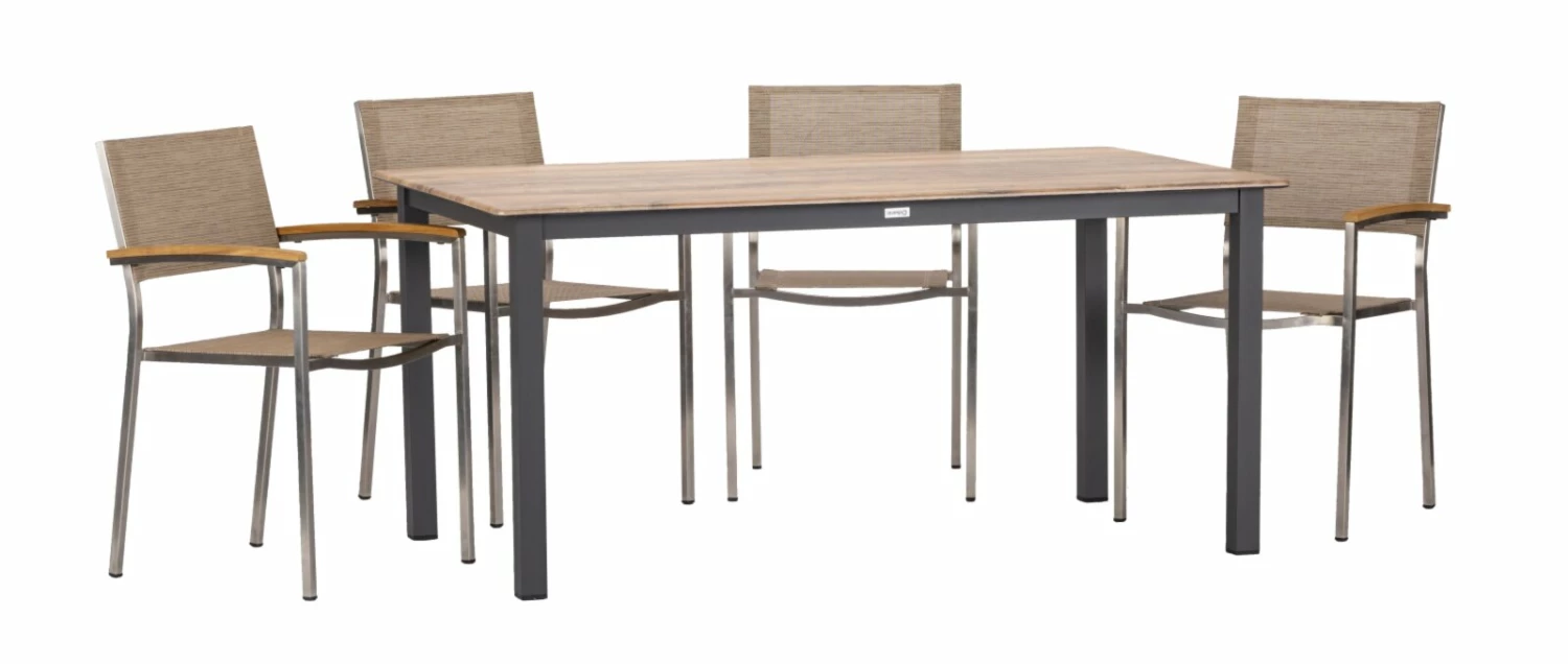 Mit diesem 5-teiligen Gartenmöbel-Set sind Sie bestens für die nächste Gartensaison gewappnet. Die Stapelsessel bestehen aus Edelstahl und sind mit einem wetterfesten sandfarbenen Acatex-Gewebe bezogen. Der Gartentisch besteht aus Aluminium und setzt mit seinem anthraziten Farbton Akzente zu den Sesseln.
