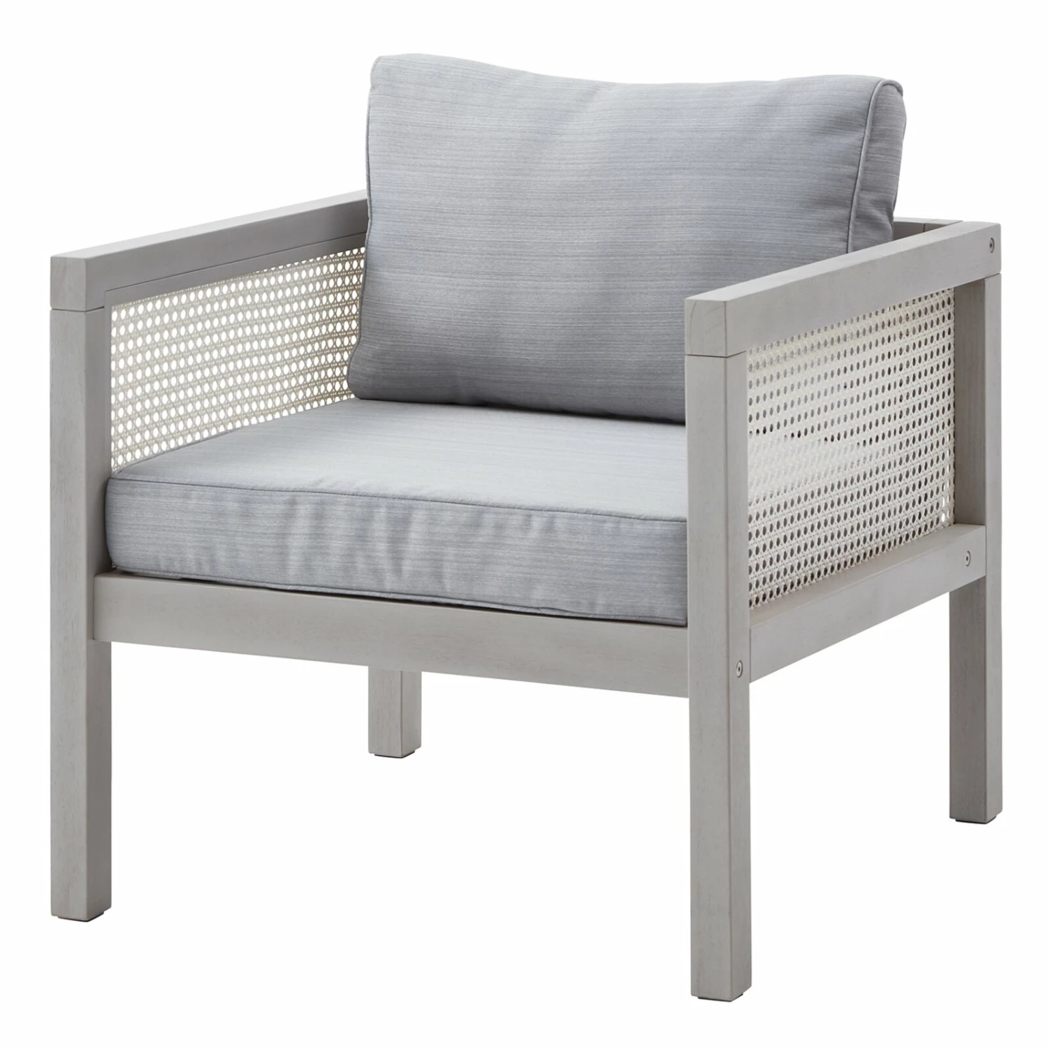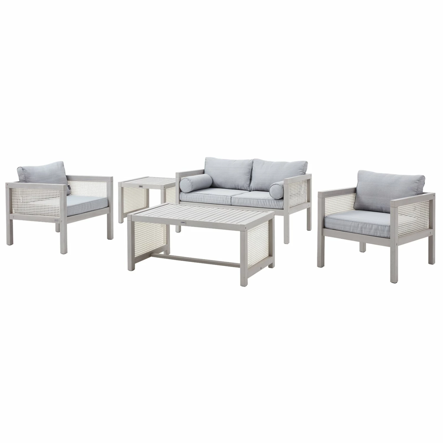 Fünfteiliges Lounge-Set bestehend aus einem Loungesofa, einem Loungetisch, zwei Sesseln und einem Beistelltisch. Die einzelnen Bestandteile bestehen aus massivem Akazienholz, an den Seiten befinden sich dekorative Elemente aus Wiener-Geflecht. Durch die schlichte und zugleich elegante Farbgebung fügt sich das Lounge-Set bestens in jeden Außenbereich.