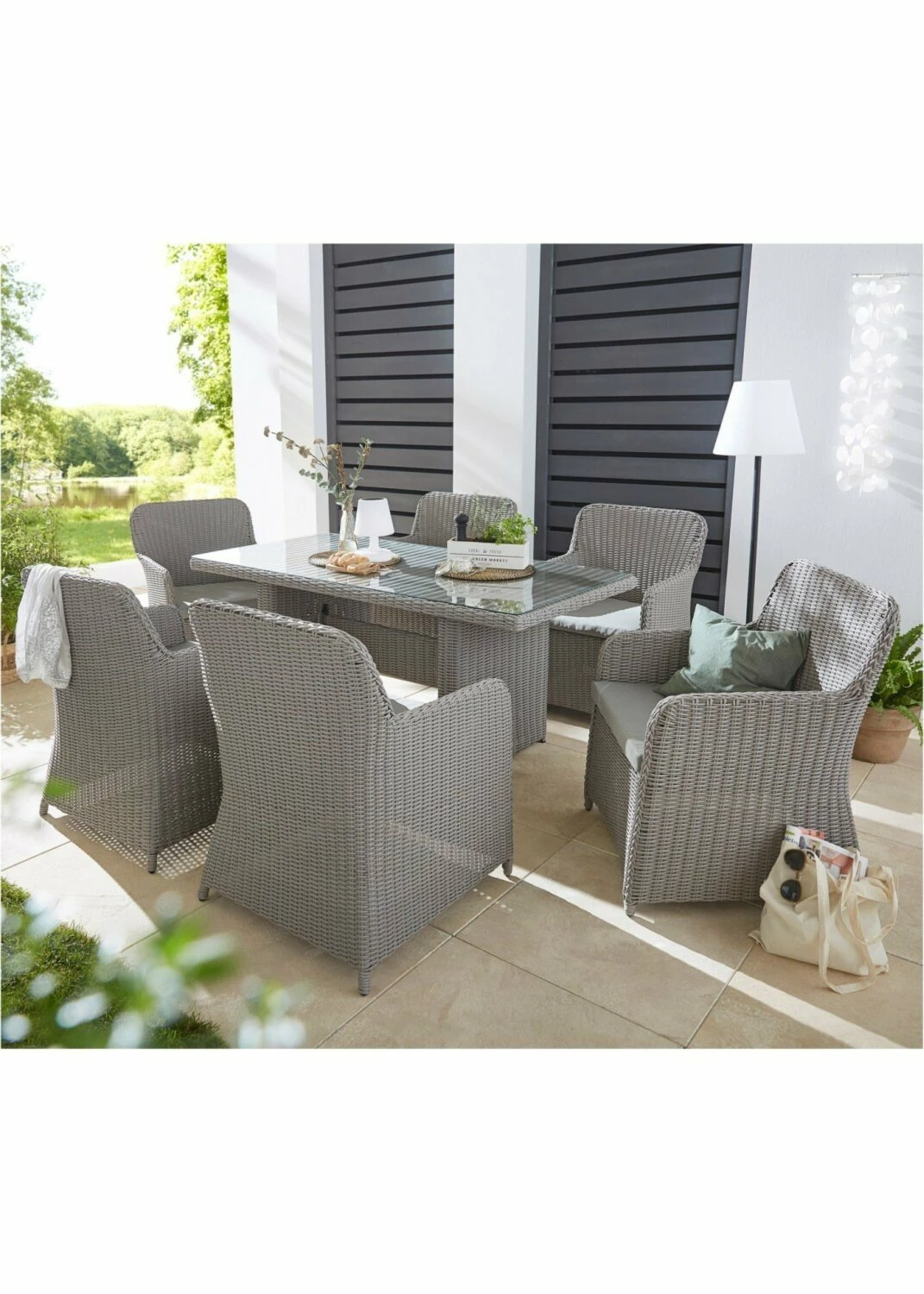 Diese 7-teilige Sitzgruppe besteht aus sechs Stühlen sowie einen rechteckigen Tisch mit einer Ablagefläche aus Glas. Das Set liefert aufgrund der Optik einen sehr modernen Flair und sieht sehr schlicht und schön aus.