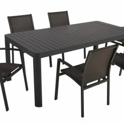 Diese moderne Tischgruppe AMIRA in einem dunklen Anthrazit ist perfekt für Ihren Garten und Außenbereich. Das Set besteht aus sechs Stühlen mit einer Sitzfläche aus einem PVC-Polyester-Mix und einem ausziehbaren Tisch mit einem Schienensystem für einen seitlichen Auszug. Der Tisch hat eine Breite von etwa 195 Zentimeter, die auf bis zu 240 Zentimetern erweitert werden kann.