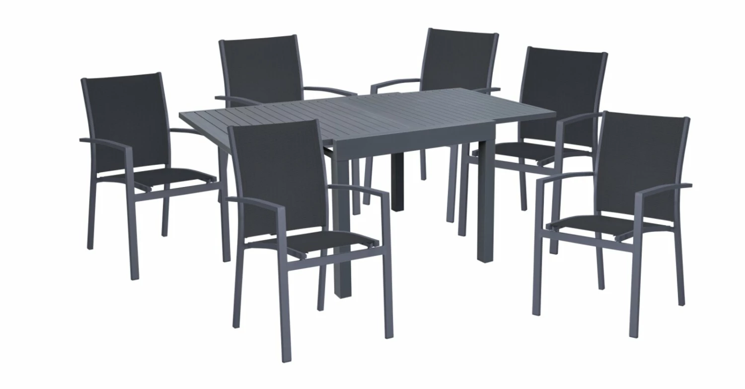 Siebenteilige Tischgruppe bestehend aus einem ausziehbaren Tisch und sechs passenden Stühlen. Das Aluminium-Gestell macht die Möbel sehr leicht und stabil zugleich. Das schlichte und gleichzeitig moderne Design passt ideal in jeden Außenbereich – egal, ob Garten, Terrasse oder Balkon. Genießen Sie das schöne Wetter im Freien mit diesen schicken Gartenmöbeln, die sich auch bestens mit anderen Möbelstücken für den Außenbereich kombinieren lassen.