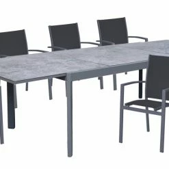 Diese 7-teilige Tischgruppe NEREA bietet Ihnen ausreichend Platz für Sie und Ihre Gäste und ist ideal für eine Gartenparty. Im Lieferumfang sind sechs Stühle mit einer Sitzfläche aus einem PVC-Polyester-Mix und ein ausziehbarer Tisch aus pulverbeschichteten Aluminium enthalten. Der Tisch hat eine Breite von etwa 200 Zentimetern, die auf bis zu 300 Zentimeter erweitert werden kann und so noch mehr Platz bietet. Das moderne Design in Anthrazit passt in den sämtlichen Einrichtungsstilen.