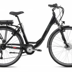 Das E-Bike mit dem tiefen Einstieg erfreut in klassischen Schwarz den Betrachter und ist ein leistungsstarker Begleiter auf Kurzdistanzen, aber auch auf längeren Strecken. Auch ohne Zuschalten des Elektromotors macht das dank des Aluminiumrahmens eher leichte Fahrrad Spaß. Mit sieben Gängen kommen Sie gut über Hügel oder Steigungen, die Federgabel gleicht Unebenheiten auf den Wegen aus und mit der kompletten Lichtausstattung vorne wie auch hinten ist das Fahren auch ohne Tageslicht sicher. Für noch mehr Spaß sorgt der Motor, der an der Vorderradgabel angebracht ist, und in fünf unterschiedlich starken Stufen beim Fahren unterstützen kann. Ganz einfach per Knopfdruck über das am Lenker angebrachte Display entscheiden Sie, ob bzw. wieviel „elektrischen Rückenwind“ Sie gerne hätten. Die Kapazität des hochwertigen Lithium-Ionen-Akkus reicht für bis zu 80 km Reichweite. Innerhalb von etwa sieben Stunden ist der Akku wieder geladen.