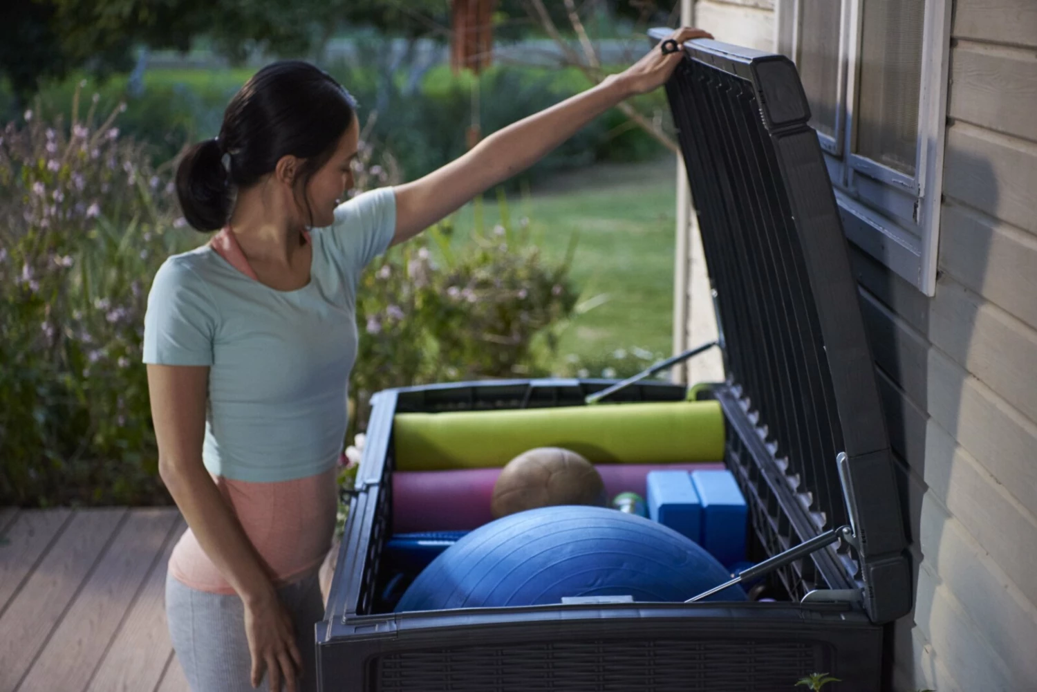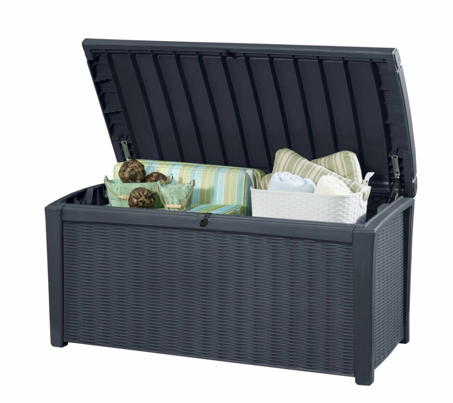 Mit ihrer formschönen Rattanoptik setzt die Aufbewahrungsbox einen Akzent in Ihrem Garten. Nicht nur zum Verstauen von Sitzauflagen ist die Kiste geeignet, sie kann auch individuell eingesetzt werden, z.B. als Stauraum für Gartenwerkzeuge, Gartenschlauch, leere Blumentöpfe oder Spielzeug. Praktischerweise ist die Box abschließbar, so sind Ihre Gegenstände sicher aufbewahrt. Für die Gartenparty können Sie die Universalbox ganz einfach als kleine Gartenbank verwenden. Die witterungs- und UV-beständige Box trotzt Regen und Sonne und lässt sich mithilfe der Gasdruckfeder ganz einfach öffnen und schließen.