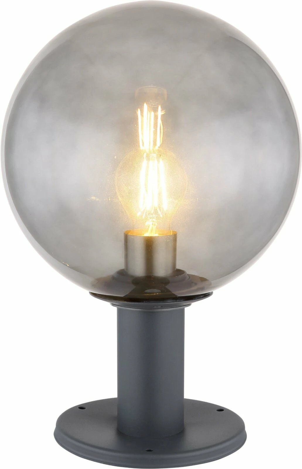 Die Außenlampe ist duch das Design aus anthrazitfarbenem Aluminium-Druckguss besonders schlicht. Des Weiteren kann die Wegelampe mit einem Durchmesser von 25 Zentimetern mit ihrem Sockel wunderbar auf ebenen Untergründen fixiert werden. Außerdem ist das Leuchtmittel mit einer rauchigen Glaskugel bedeckt, sodass das Licht natürlich und besonders schön im Dunkeln in deinem Außenbereich scheinen kann.