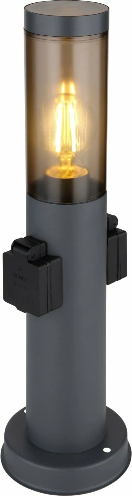 Die Außenleuchte in Anthrazit ist nicht nur wegen der zwei Steckdosenanschlüsse ein echtes Prachtstück, sonder auch wegen des rauchfarbendes Glases, welches für eine moderne Atmosphäre sorgt.