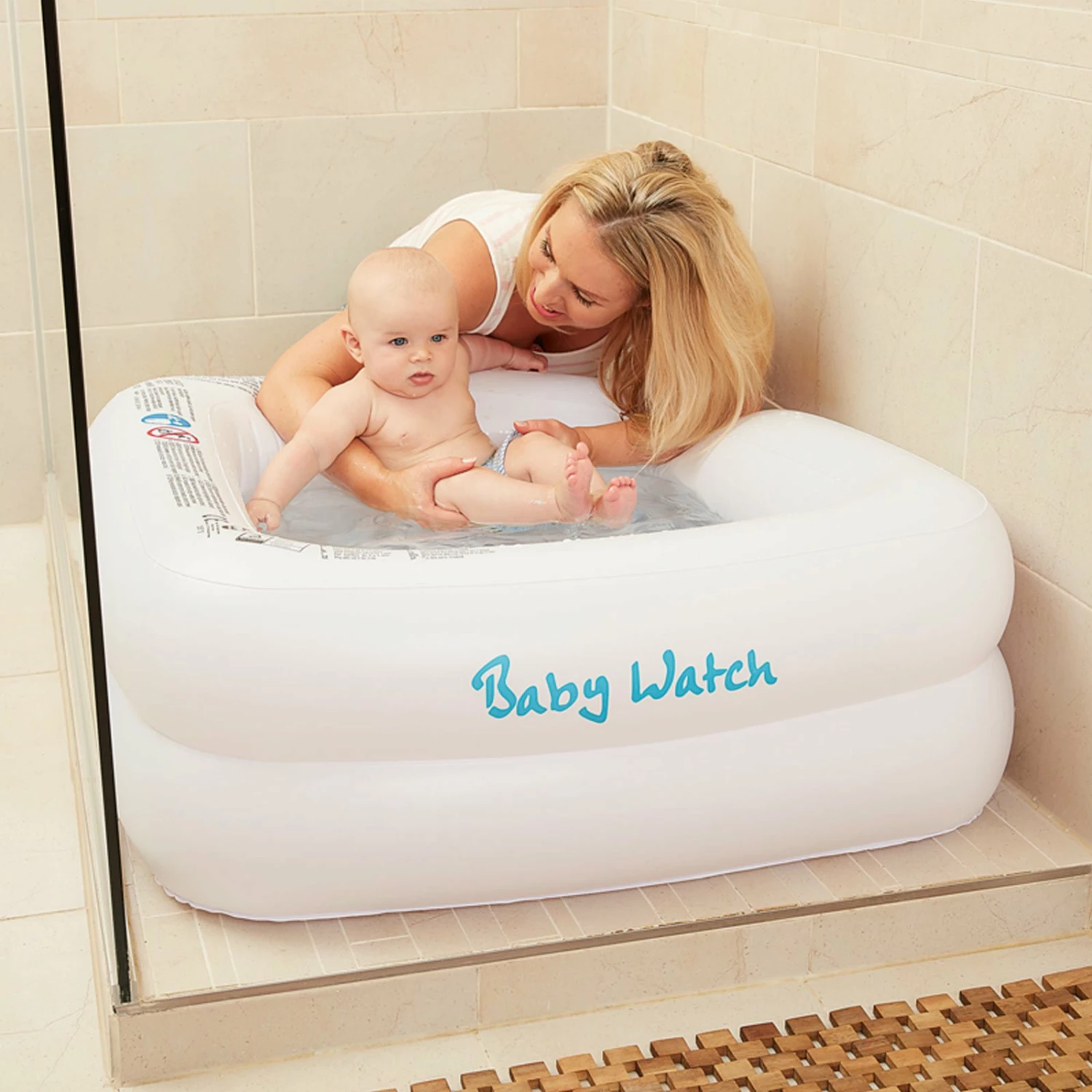 Babybaden geht auch ohne Badewanne. Mit diesem praktischen Babywatch-Pool in Weiß. Aufgeblasen hat er eine Stellfläche von ca. 85 x 85 cm, die Sie in die Dusche oder auf den Badboden stellen können. Im Sommer können Sie ihn auch auf dem Balkon oder der Terrasse nutzen. Das Baby wird es sehr bequem haben, da der Boden ebenfalls aufblasbar ist. Praktisch ist das Ablassventil im Boden, so dass der Pool nicht gekippt werden muss, um ihn zu leeren.