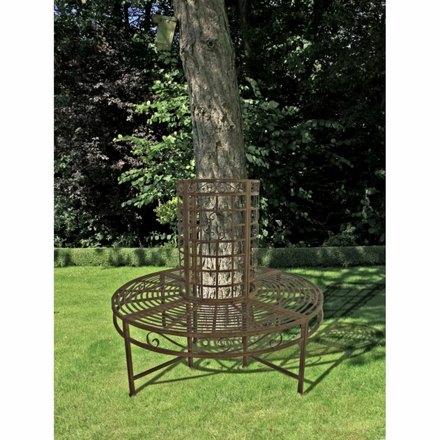 Diese romantische Baumbank LARISSA aus pulverbeschichtetem Stahl in Rost und Bronze-Optik wird Ihren Garten verschönern. Auf der Bank haben bis zu acht Personen Platz, um im Kreis unter einer Baumkrone zu verweilen und die Natur zu genießen.