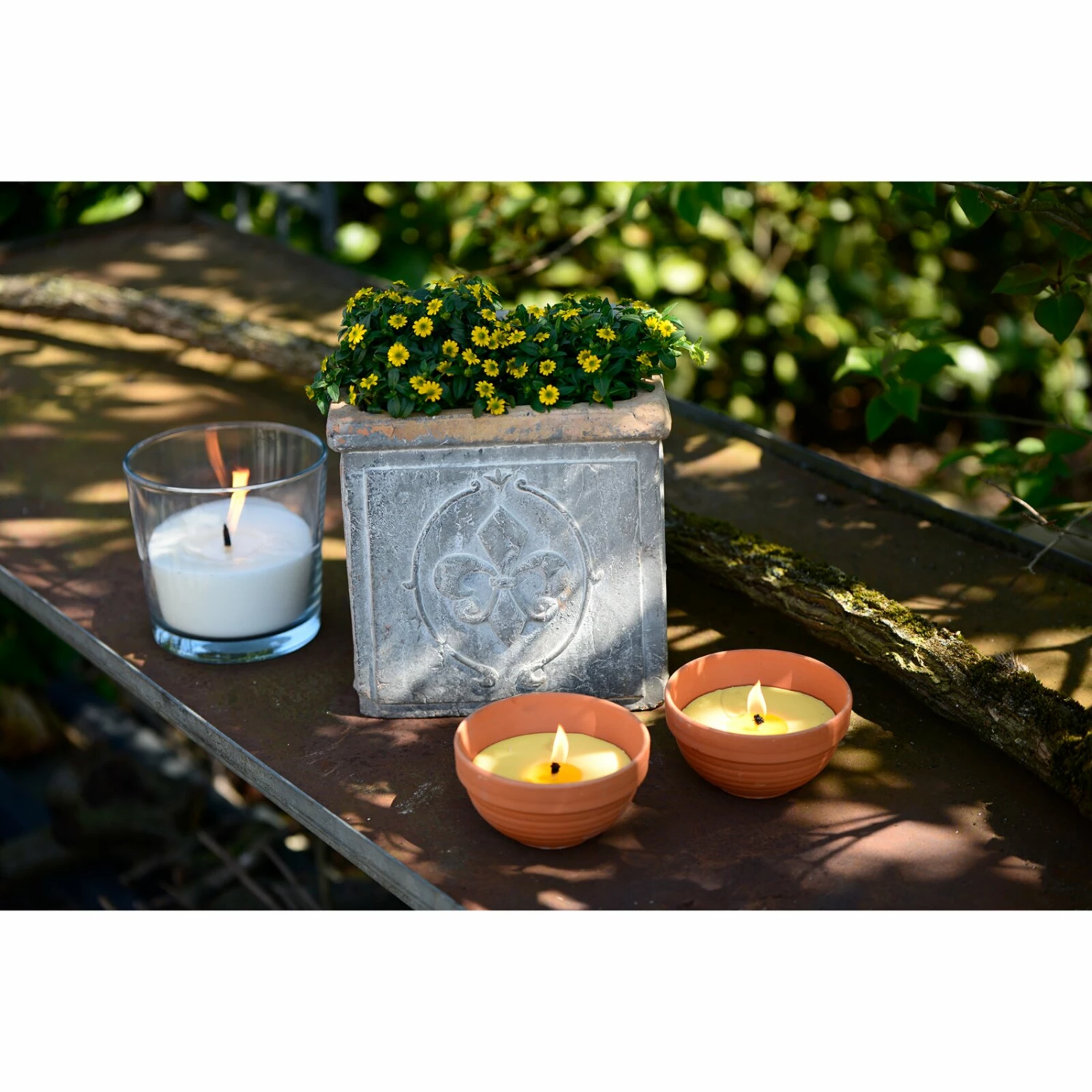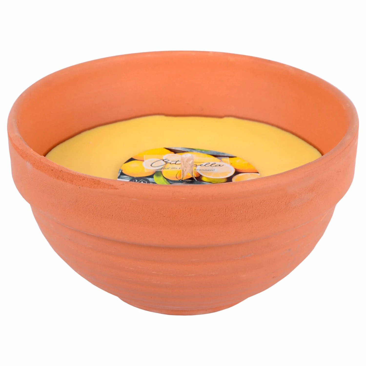 Schöne Kerze mit Citronella-Duft in hübscher Tonschale. Die Kerze gibt nicht nur ein schönes Licht ab, sondern verleiht Ihrem Außenbereich auch ein wohnliches Flair. Die Brenndauer beträgt etwa 14 Stunden.