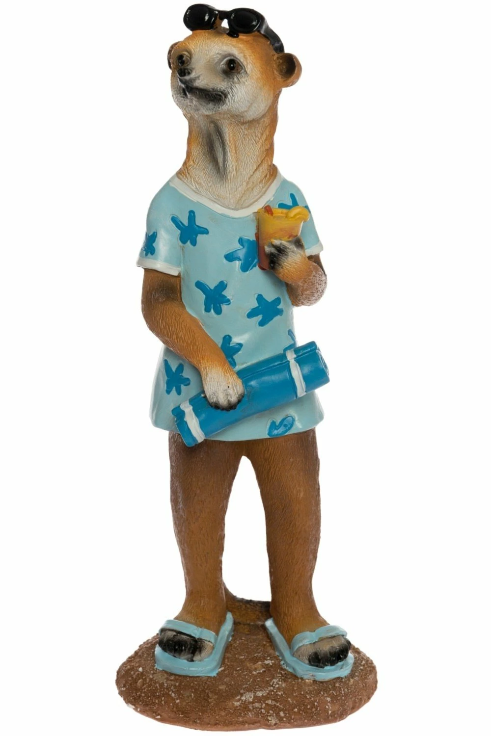 Das Deko-Erdmännchen ist aus Steinharz und es trägt Sommerkleidung in Blau. Super niedlich, allein oder in Kombination.
