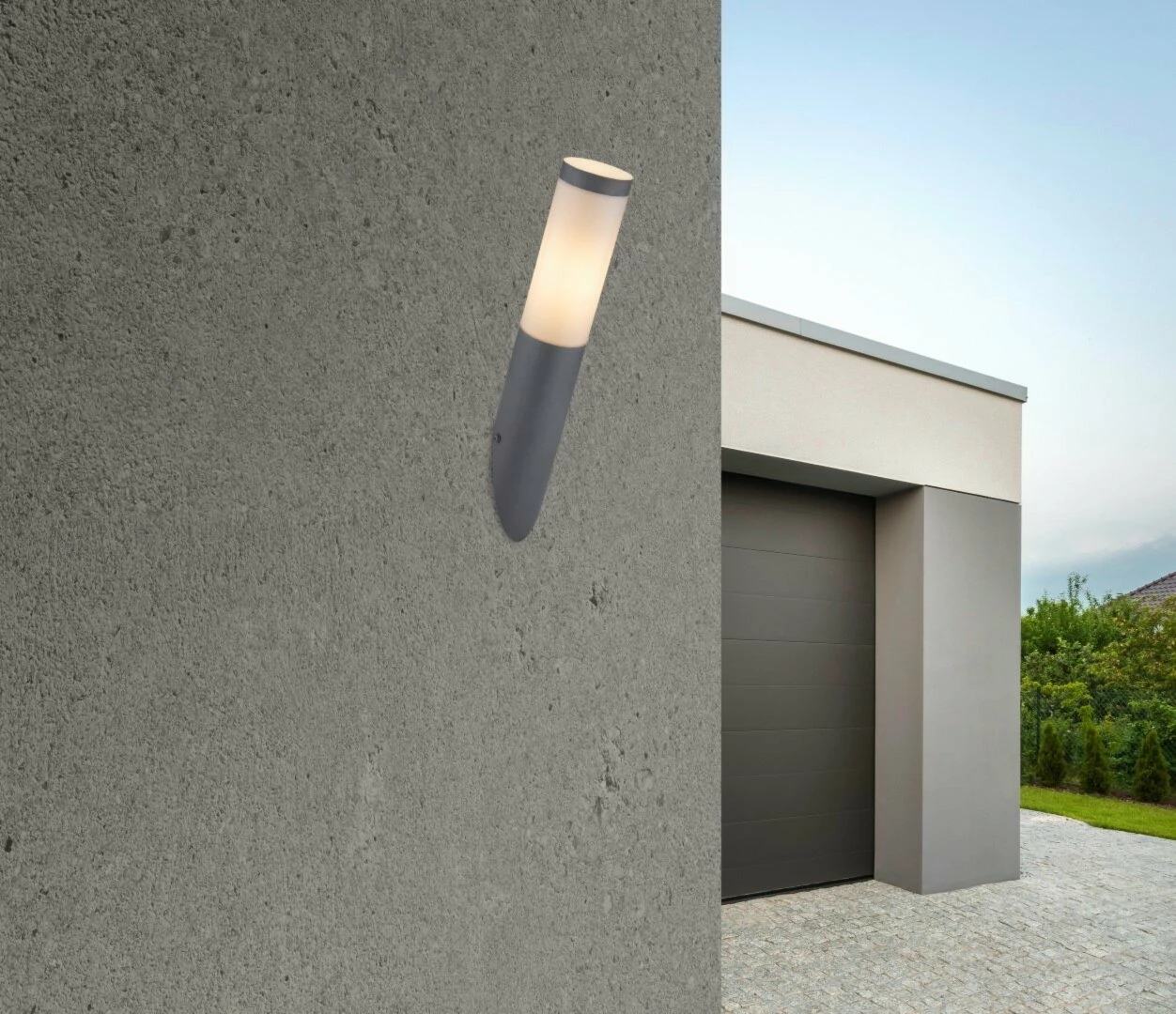 Diese formschöne Außenleuchte in Form einer Fackel ist die ideale Lampe für den Garten oder den Eingangsbereich. Die Wandlampe besteht aus Edelstahl, Kunststoff und die schlichte Farbe in Grau passt in jeden Außenbereich. Aufgrund der Schutzart IP44 bietet die Lampe Schutz gegen allseitiges Eindringen von Spritzwasser und ist vor dem Eindringen fester Fremdkörper mit einem Durchmesser über einem Millimeter geschützt.