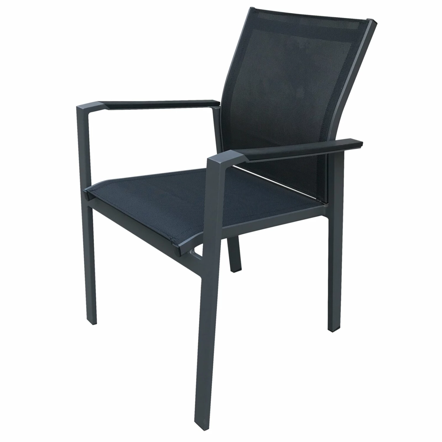Mit diesem anthrazit-schwarzen Gartenstuhl genießen Sie den Sommer von seiner sonnigen und praktischen Seite. Der Sessel ist stapelbar und sein dezentes, aber dennoch modernes Design passt sich vielen Garten- und Terrassenmöbeln perfekt an und lässt sich somit gut kombinieren. Der schwarze Textilene-Stoffbezug bietet einen tollen Sitzkomfort und macht den Aufenthalt im Freien für Sie und Ihre Gäste zu einer bequemen Angelegenheit.