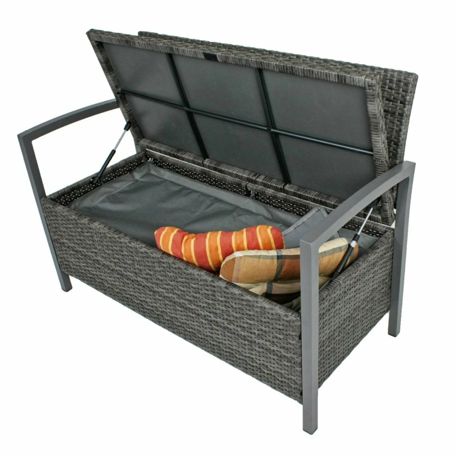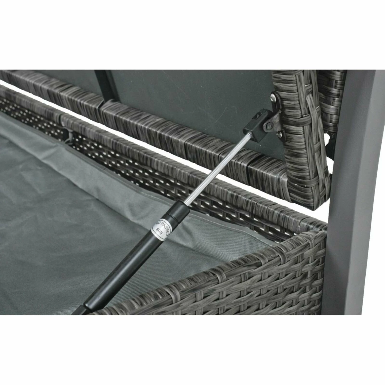 Die Gartenbank FERRARA in Dunkelgrau ist aus einem Kunststoffgeflecht gefertigt, welches über einem Aluminiumgestell liegt. Unter der Sitzfläche befindet sich ein Ablagefach, in dem sich z.B. verschiedene Gartenutensilien verstauen lassen. Das Staufach wird mit einer Gasfeder offen gehalten und es ist befindet sich eine Tasche für Ihre Utensilien darin.