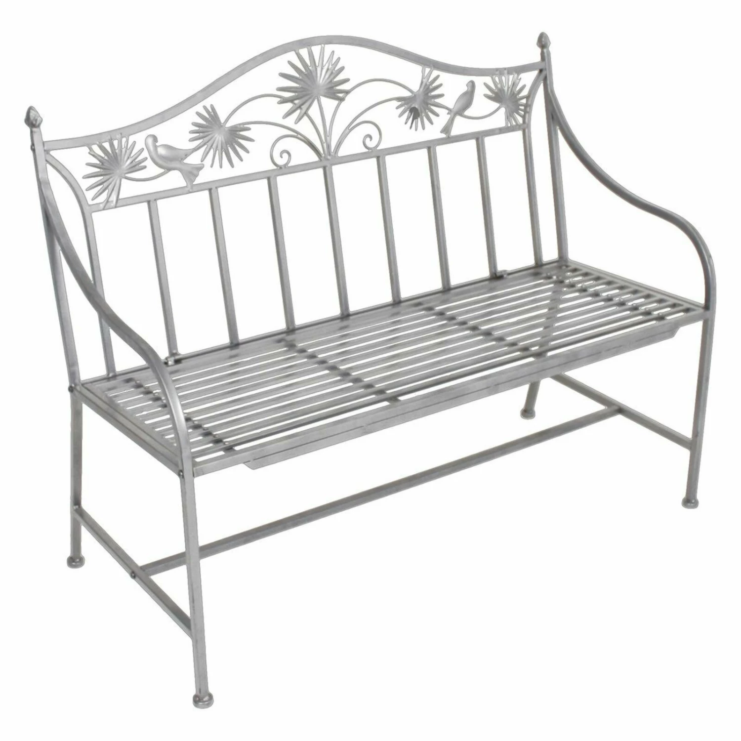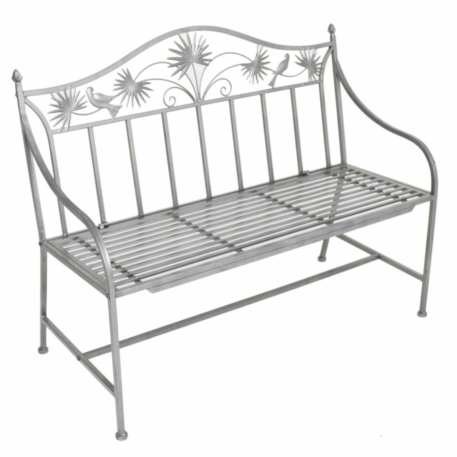 Stilvoll gestaltete Gartenbank TALIN aus Metall in grauer Hammerschlag-Lack-Optik mit graziösen Ornamenten in Blatt- und Vogelform in der Rückenlehne.