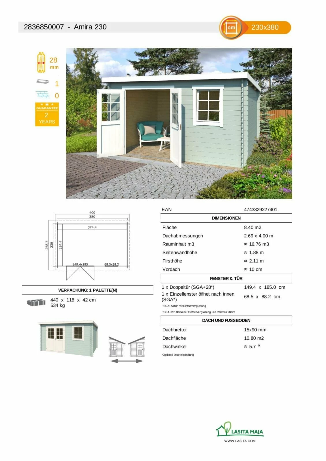Gartenhaus AMIRA – gletschergrün – Fichte massiv – 380×230 cm