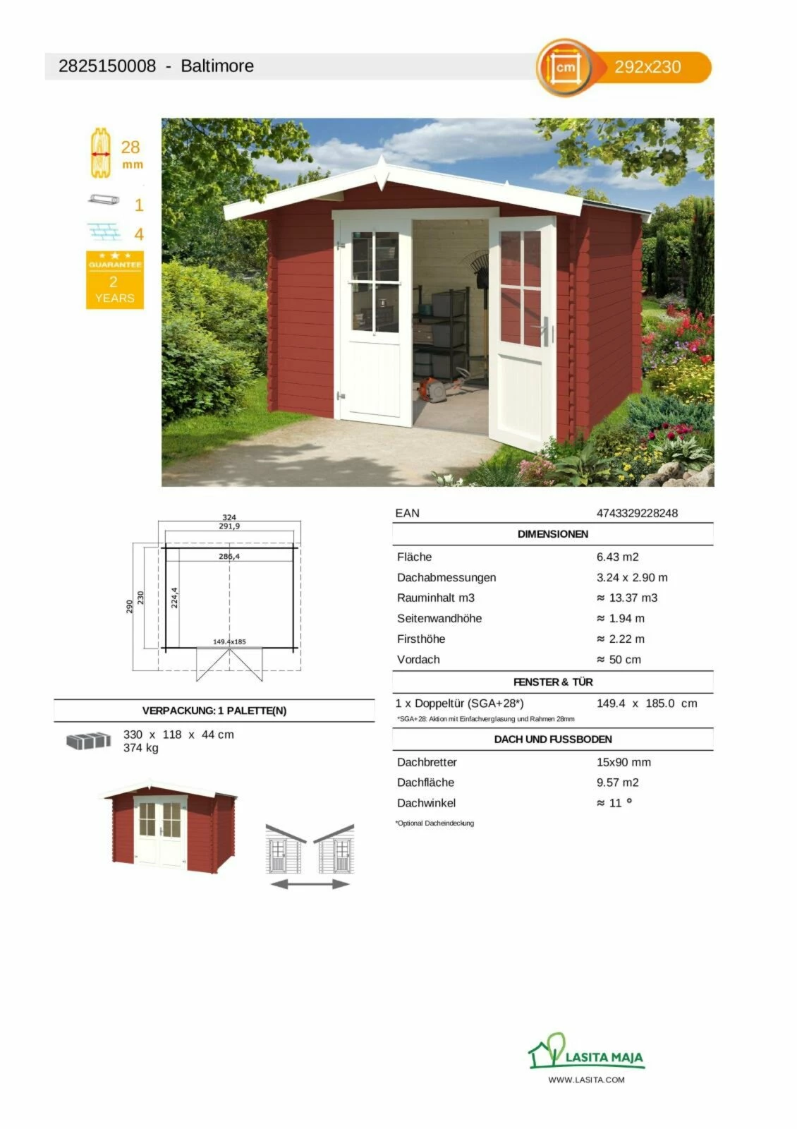 Gartenhaus BALTIMORE – schwedenrot – Fichte massiv – 292×230 cm