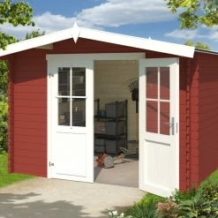 Das Gartenhaus BALTIMORE lässt sich ohne Probleme zur Lagerung verschiedener Gartengeräte einsetzen. Durch die große Doppeltür mit Echtglas lässt sich hier alles komfortabel verstauen. Das Material besteht zu 100% aus nordischer Fichte, und ist in verschiedenen Farbtönen erhältlich.