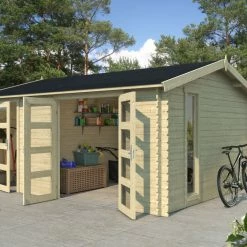 Das Gartenhaus CARROZ 2 in naturbelassener Optik wurde aus hochwertiger, nordischer Fichte hergestellt und bietet mit rund 16 Quadratmetern und zwei Räumen ausreichend Platz für einen Ruheort und einen Stauraum für Gartenwerkzeuge und Geräte.
