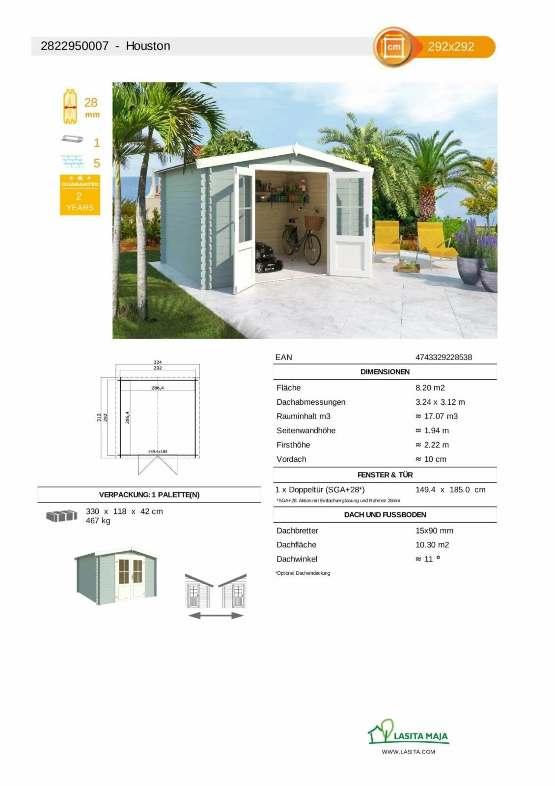 Das quadratische Gartenhaus HOUSTON dient zum Verweilen oder als Lagermöglichkeit für Ihre Gartengeräte. Vielfältige Einsatzmöglichkeiten sind also in diesem hochwertigen Gartenhaus aus 100% nordischer Fichte garantiert. Eine große Doppeltür sowie das Satteldach runden das stimmige Design ab.