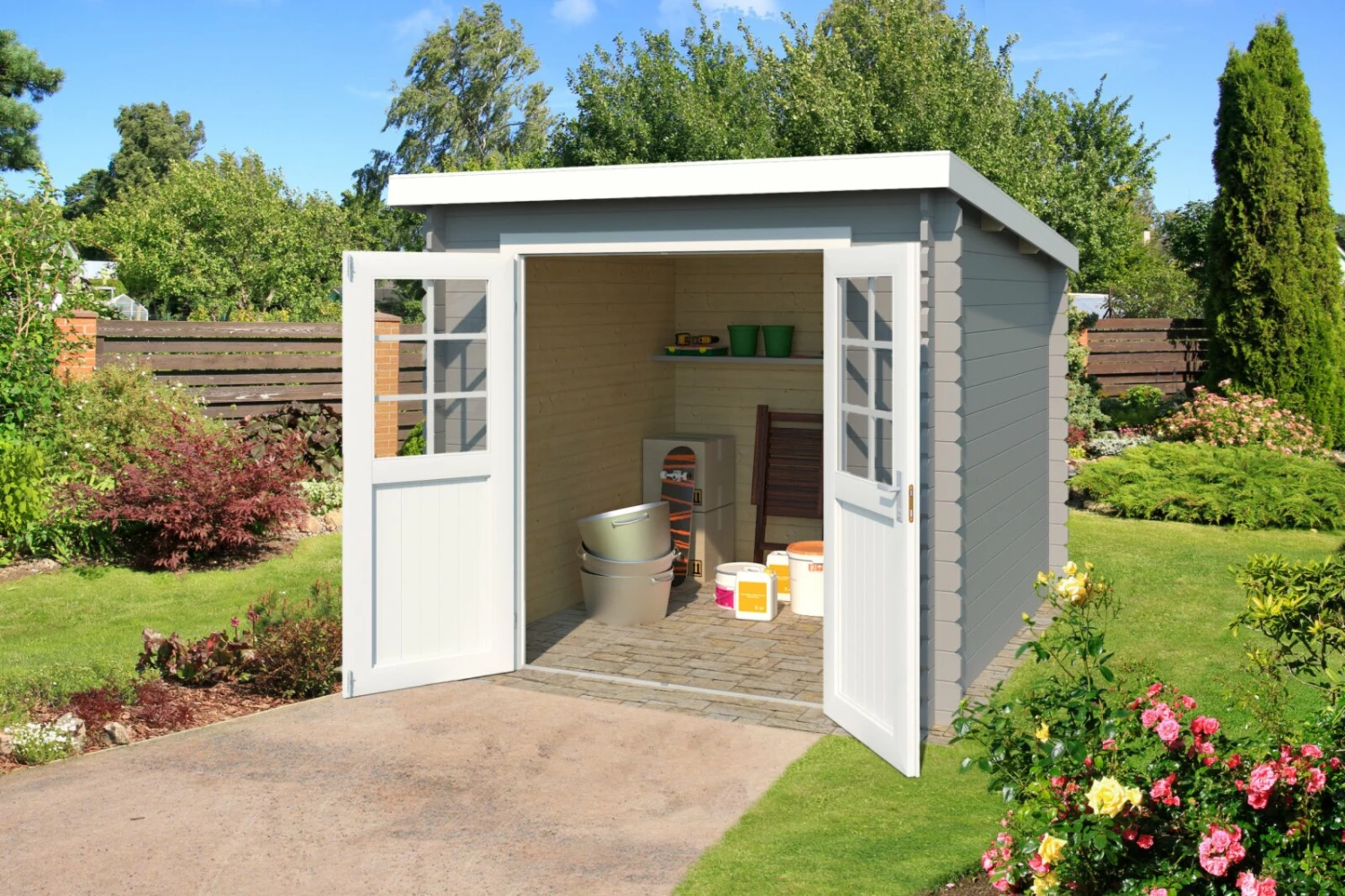 Gartenhaus INDI – lichtgrau – Fichte massiv – 230×230 cm