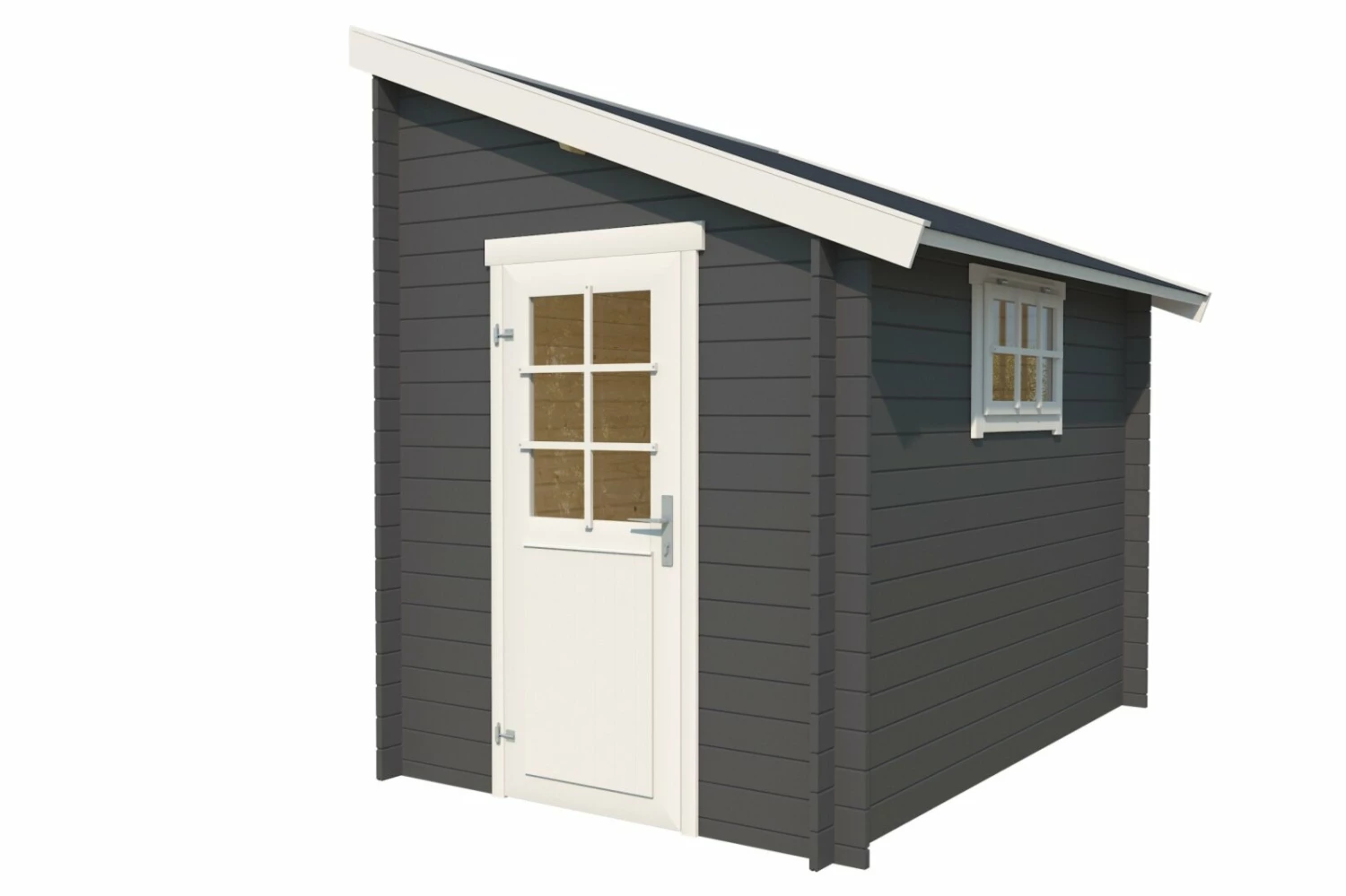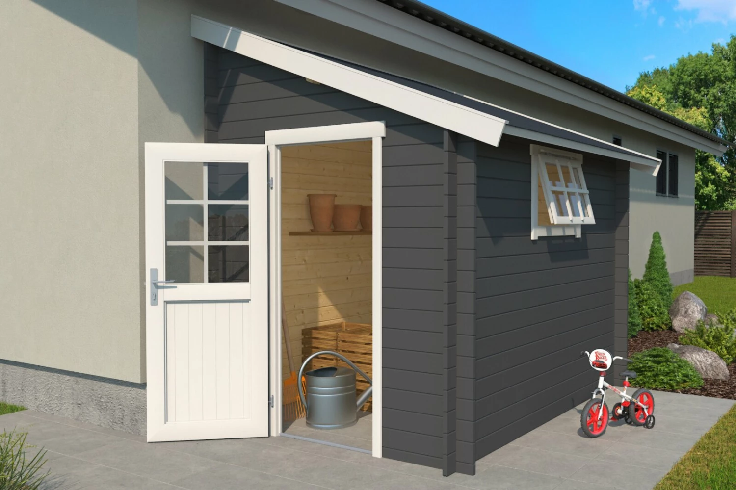 Dieses Gartenhaus in Carbongrau kann sich sehen lassen! Die Farbgebung und das Pultdach geben dem Gartenhaus einen modernen Look. Dabei verfügt das Gartenhaus über ein äußerst nützliches Design. Durch das Pultdach können Sie das Haus an jeder Außenwand platzieren, wodurch Ihr Garten organisiert und ordentlich wirkt.