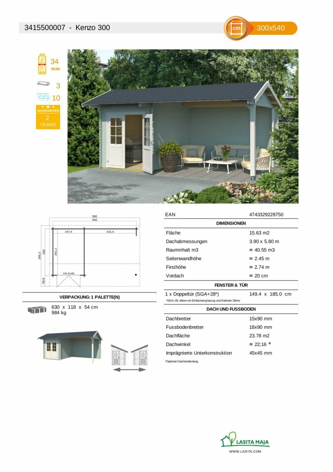 Das Gartenhaus KENZO kombiniert eine großzüzige Sitzmöglichkeit mit ausreichendem Lagerraum. Der Geräteraum ist durch die große Doppeltür mit Echtglas zu erreichen. Der Sitzbereich ist mit überdacht, und bietet somit eine wetterunabhängige Möglichkeit zum entspannen. Das benötigte Montagematerial sowie der passende Fußboden sind bereits im Lieferumfang enthalten.