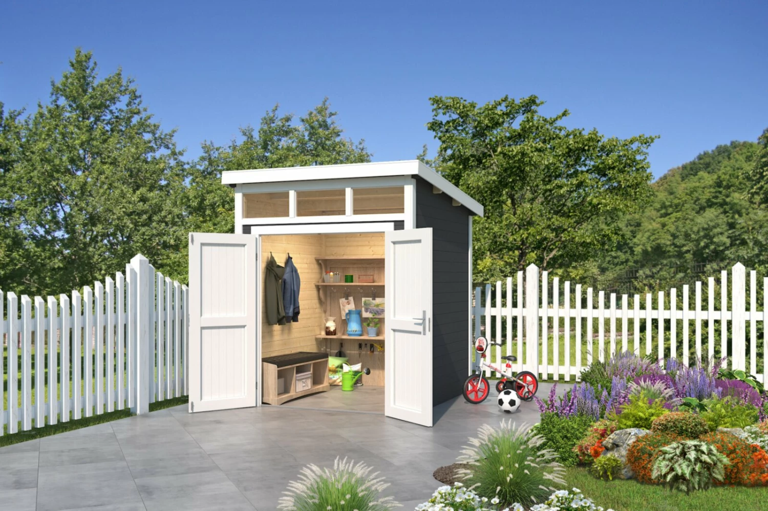 Das etwa 200 x 200 cm große Gartenhaus KIBO 1 mit flachem Dach lässt sich hervorragend als Abstellraum nutzen. Durch die Wandhöhe von etwa 222,3 cm eignet sich dieses Gartenhaus perfekt zur Lagerung von größeren Gartengeräten. Durch die Oberlichter über der großen Doppeltür fällt auch genügend Licht hinein.