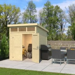 Das etwa 200 x 250 cm große Gartenhaus KIBO 2 mit flachem Dach lässt sich hervorragend als Abstellraum nutzen. Auf einer Grundfläche von etwa 4,75 m² und durch die Wandhöhe von etwa 222,3 cm eignet sich dieses Gartenhaus perfekt zur Lagerung von größeren Gartengeräten. Durch die Oberlichter über der großen Doppeltür fällt auch genügend Licht hinein.