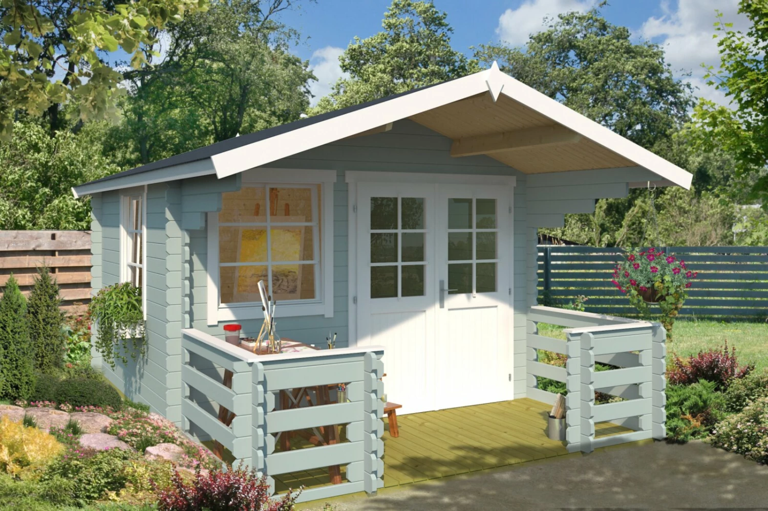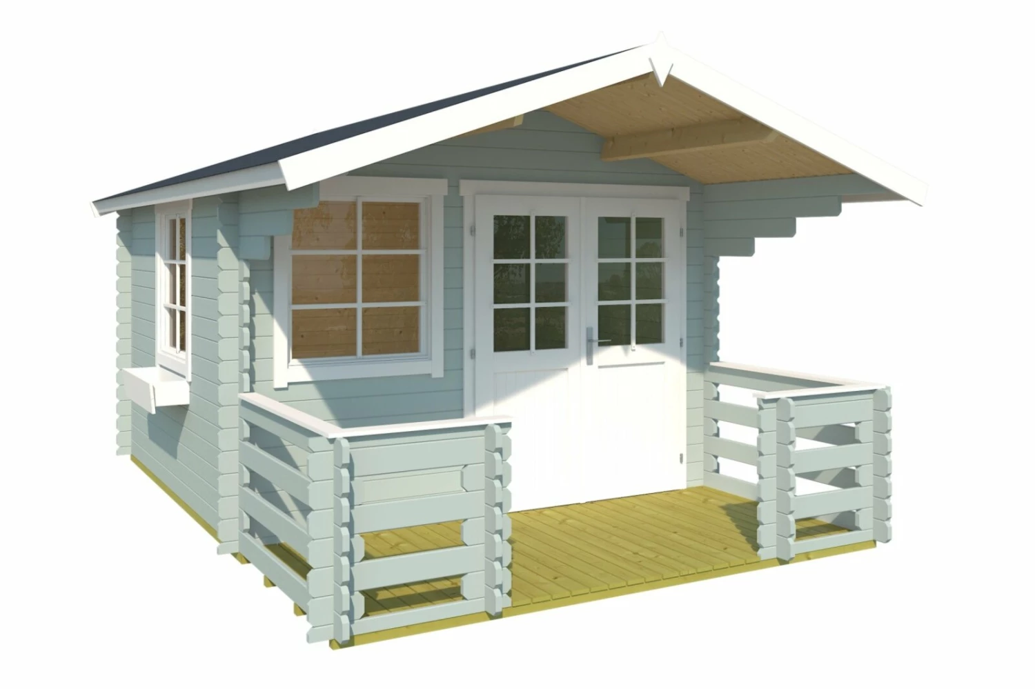 Gartenhaus LOLA 2 – gletschergrün – mit Terrasse und Geländer – 300×300 cm