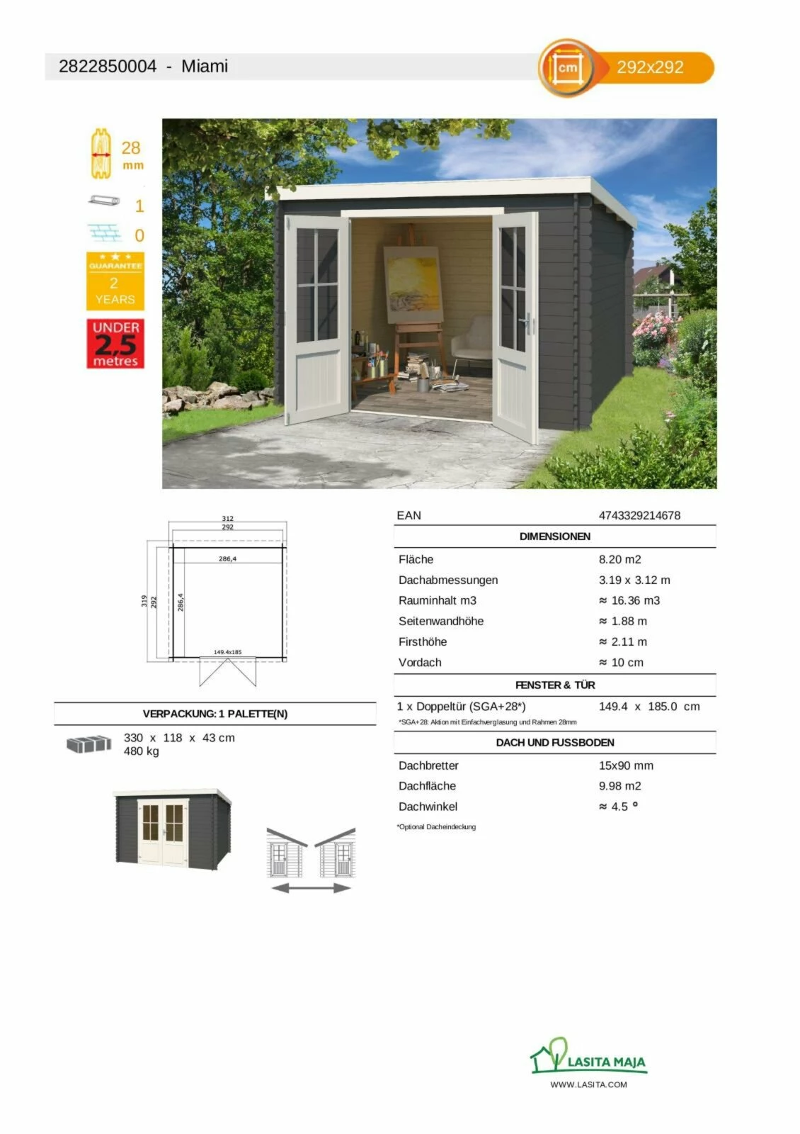 Das Gartenhaus MIAMI in Carbongrau, produziert aus hochwertiger, nordischer Fichte, ist der ideale Ort zum Lagern Ihrer Gartengeräte. Somit ist Ihr Werkzeug perfekt verstaut und stets am richtigen Platz. Montagematerial und Dachpappe sind im Lieferumfang enthalten. Der Fußboden und Dachschindeln müssen zusätzlich erworben werden.