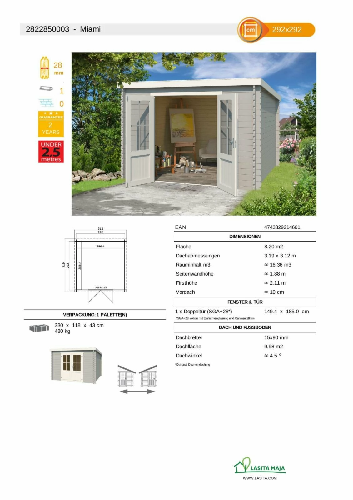 Das Gartenhaus MIAMI in Lichtgrau besteht zu 100% aus hochwertiger, massiver Fichte und bietet Ihnen circa acht Quadratmeter zur kreativen Entfaltung. Denn: Die Einsatzmöglichkeiten sind vielfältig. So kann das Gartenhaus als Stauraum für Gartenwerkzeug oder als Kreativwerkstatt genutzt werden. Durch die Doppeltür mit Echtglas ist der Lichteinfall garantiert.