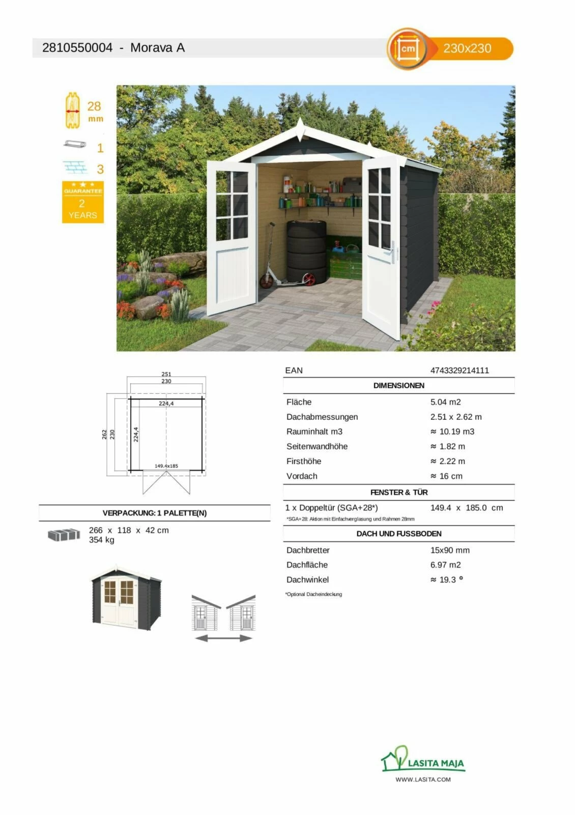 Das quadratische Gartenhaus MORAVA A bietet eine großzügige und stylische Lagermöglichkeit für diverse Gartengeräte. Durch die große Doppeltür mit Echtglas passen sowohl Besen als auch Rasenmäher. Das nötige Montagematerial sowie die Dachpappe sind bereits im Lieferumfang enthalten.