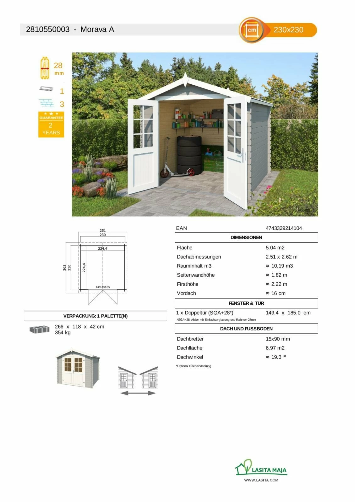 Das quadratische Gartenhaus MORAVA A bietet eine großzügige und stylische Lagermöglichkeit für diverse Gartengeräte. Durch die große Doppeltür mit Echtglas passen sowohl Besen als auch Rasenmäher. Das nötige Montagematerial sowie die Dachpappe sind bereits im Lieferumfang enthalten.