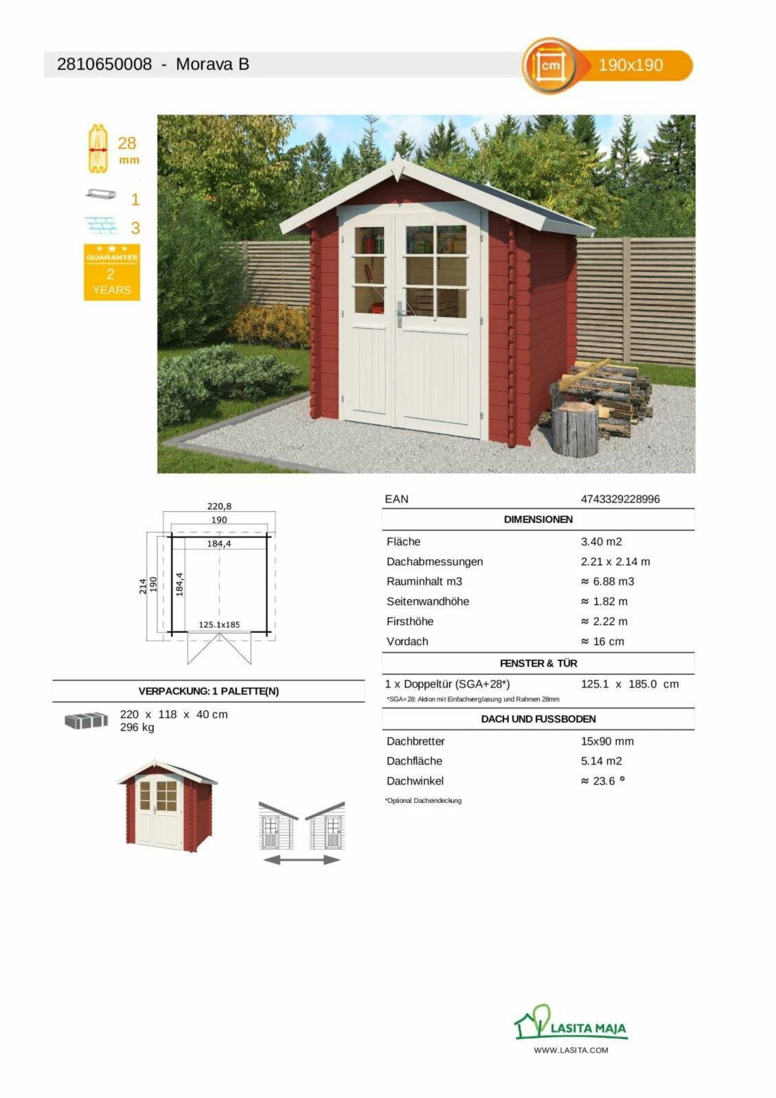 Das quadratische Gartenhaus MORAVA B bietet eine großzügige und stylische Lagermöglichkeit für diverse Gartengeräte. Durch die große Doppeltür mit Echtglas passen sowohl Besen als auch Rasenmäher. Das nötige Montagematerial sowie die Dachpappe sind bereits im Lieferumfang enthalten.