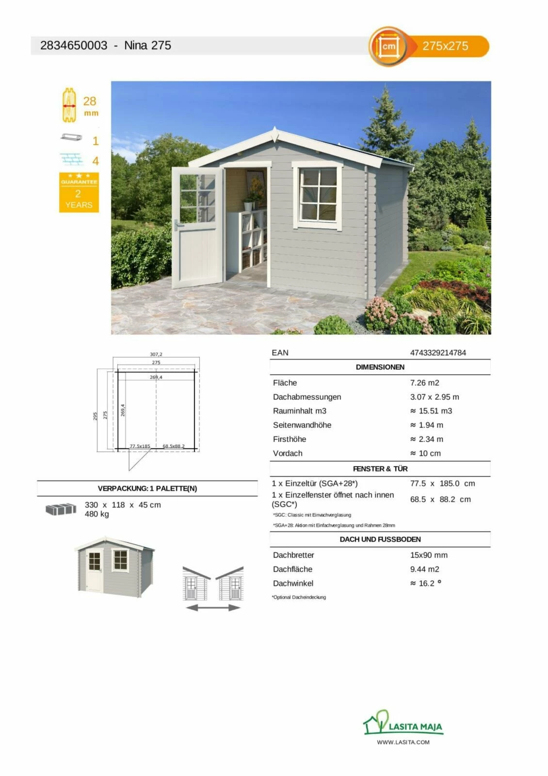Im Gartenhaus NINA finden Sie ausreichend Platz für beispielsweise Ihre Gartengeräte. Auch dank des Einzelfensters mit Echtglas ist dieses Gartenhaus sehr lichtdurchflutet, was zusätzlich einen guten Entspannungsplatz schafft. Das nötige Montagematerial sowie die Dachpappe sind bereits im Lieferumfang enthalten.