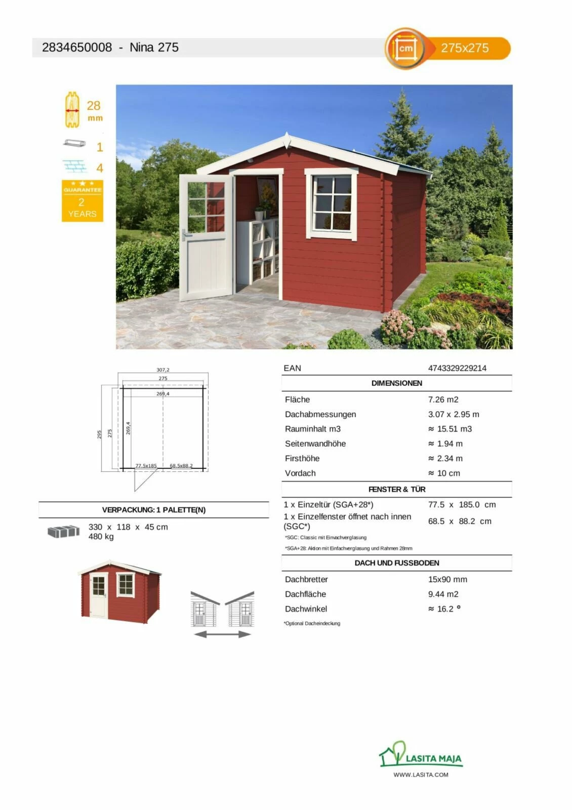 Gartenhaus NINA – schwedenrot – Fichte massiv – 275×275 cm