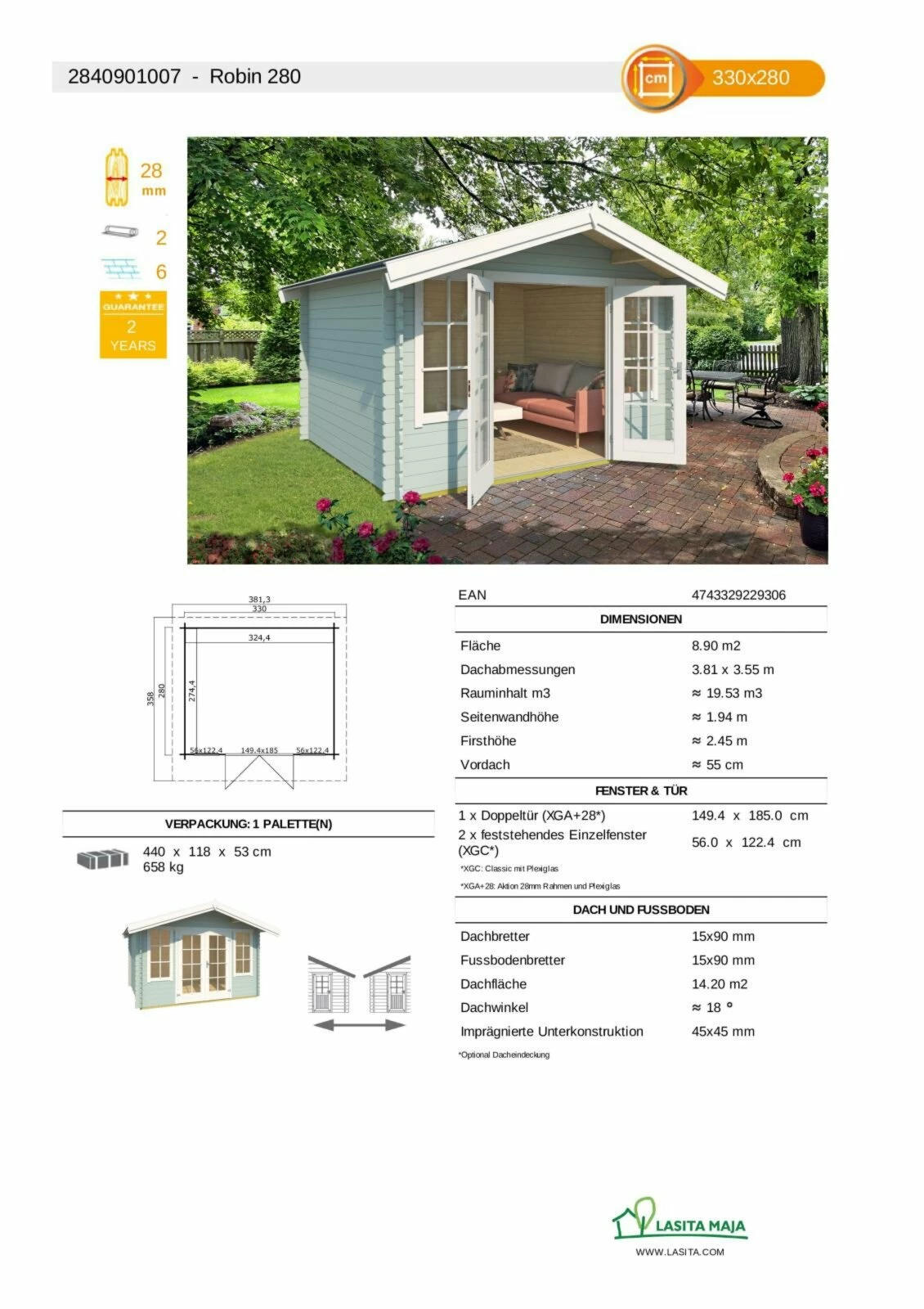 Im großzügigen Gartenhaus ROBIN finden Sie ausreichend Platz um nach Belieben zu entspannen. Zwei Einzelfenster mit Plexglas sowie eine große Doppeltür, ebenfalls mit Plexiglas, sorgen für das nötige Licht in diesem Gartenhaus. Zusätzlich ist der Fußboden bereits im Lieferumfang enthalten.