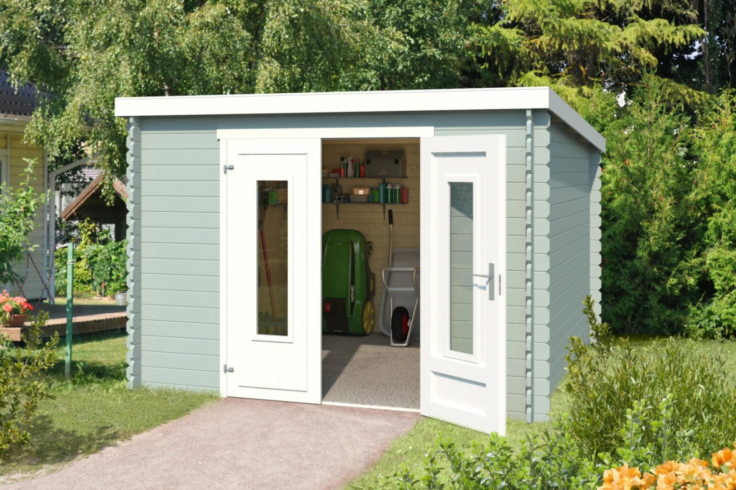 Im großzügigen Gartenhaus SACRAMENTO finden Sie ausreichend Platz um Ihre Gartengeräte sicher und einfach zu lagern. Auch größere Gartengeräte passen hier, dank der Doppeltür mit Echtglas, problemlos rein. Eine passende Dachpappe sowie das Montagematerial sind bereits im Lieferumfang enthalten.