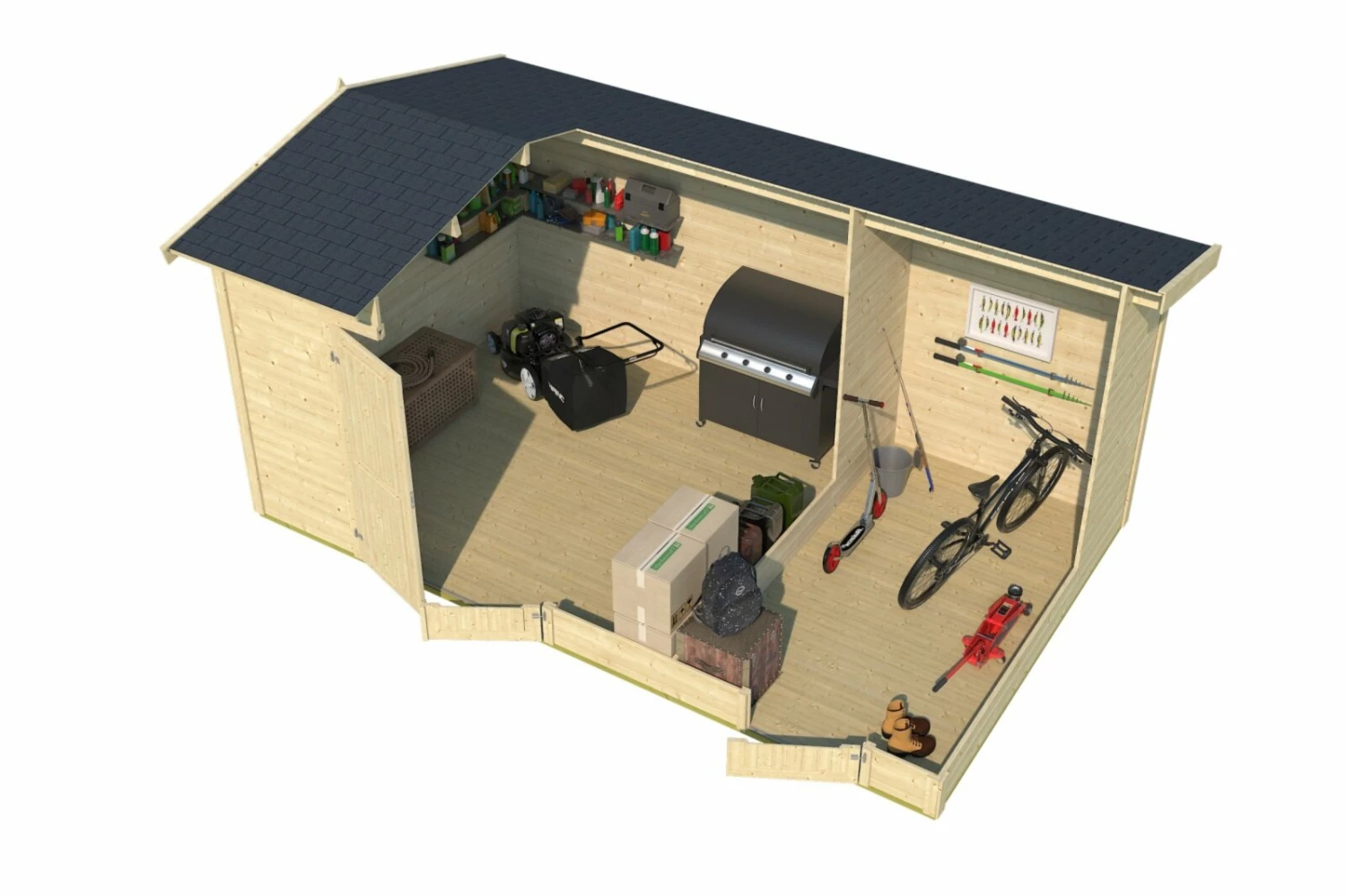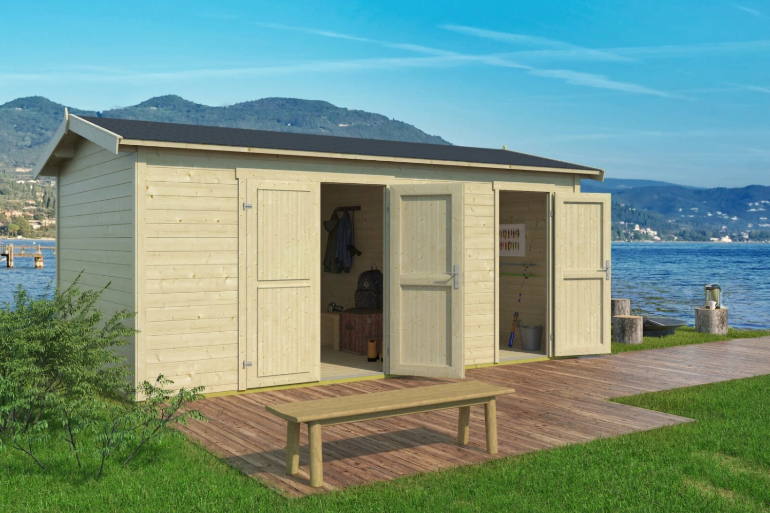 Das praktische Gartenhaus Tuvalu XL ist in zwei unterschiedlich große Räume aufgeteilt. Der größere Raum ist mit einer Doppeltür ausgestattet, sodass sich hier mit Leichtigkeit größere Gartengeräte oder beispielsweise ein Grill verstauen lassen. Der kleinere Raum ist mit einer Vollholztür verschlossen und eignet sich gut, um kleinere Gartenutensilien zu lagern. So können Sie mit diesem Blockbohlenhaus wunderbar für Ordnung in Ihrem Garten sorgen.