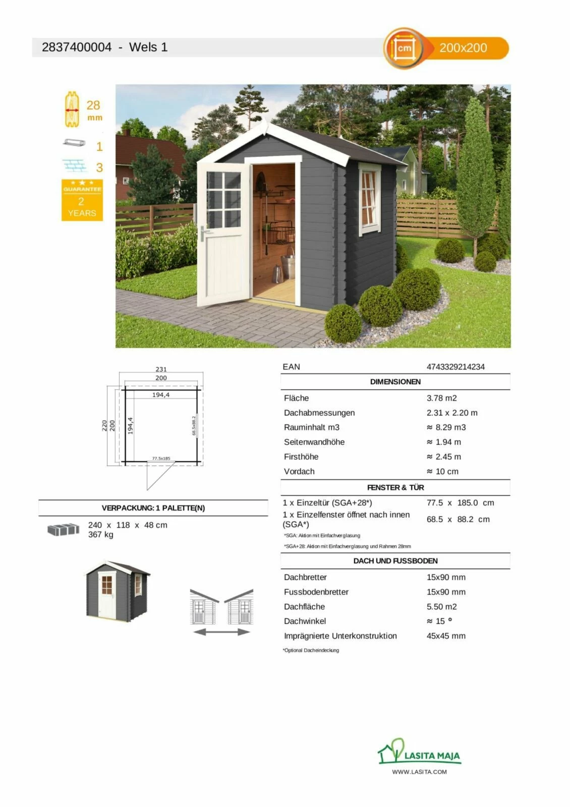 Das Gartenhaus WELS 1 ist der optimale Aufbewahrungsort für Ihre Gartengeräte, Fahrräder oder Werkzeuge. Das Gartenhaus wurde aus hochwertiger, nordischer Fichte produziert und der Fußboden sowie das Montagematerial sind im Lieferumfang inbegriffen.