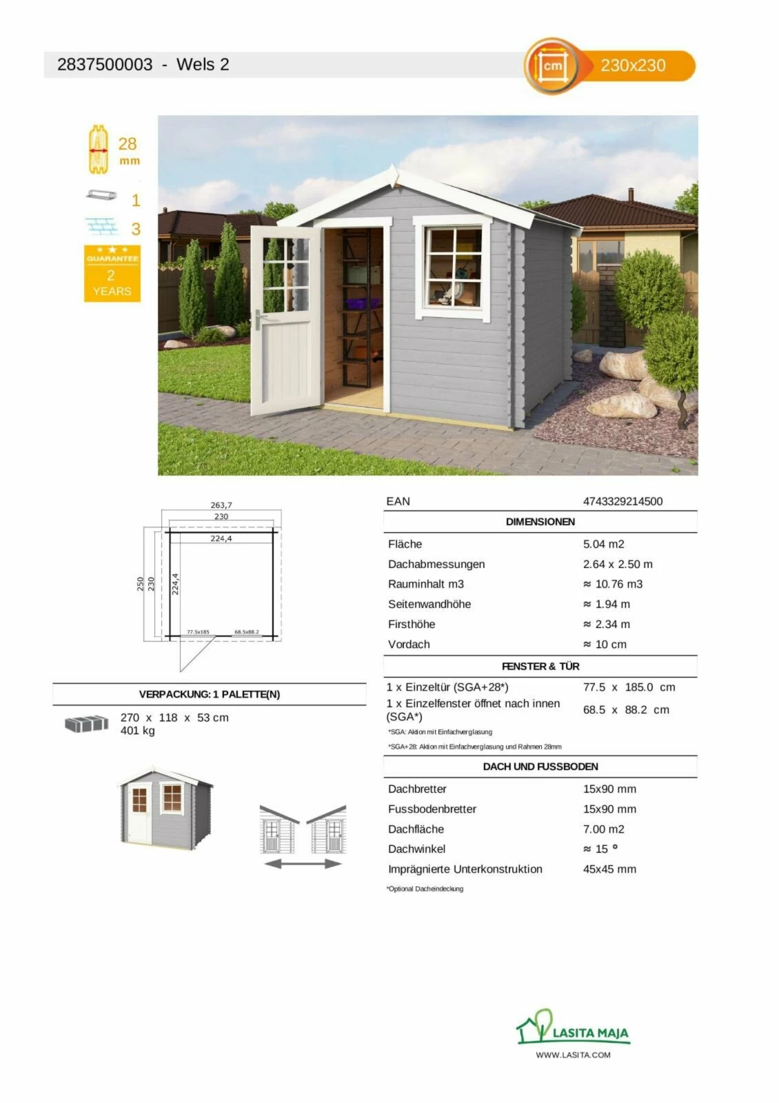 Das Gartenhaus WELS 2 ist der optimale Aufbewahrungsort für Ihre Gartengeräte, Fahrräder oder Werkzeuge. Das Gartenhaus wurde aus hochwertiger, nordischer Fichte produziert und der Fußboden sowie das Montagematerial sind im Lieferumfang inbegriffen.
