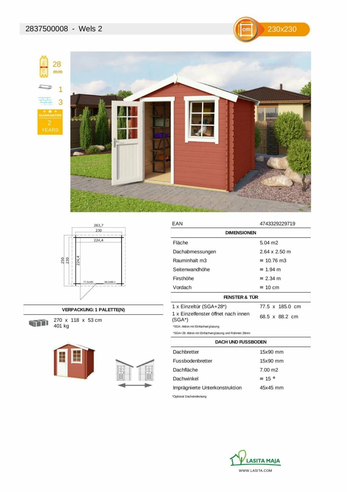 Das Gartenhaus WELS 2 ist der optimale Aufbewahrungsort für Ihre Gartengeräte, Fahrräder oder Werkzeuge. Das Gartenhaus wurde aus hochwertiger, nordischer Fichte produziert und der Fußboden sowie das Montagematerial sind im Lieferumfang inbegriffen.