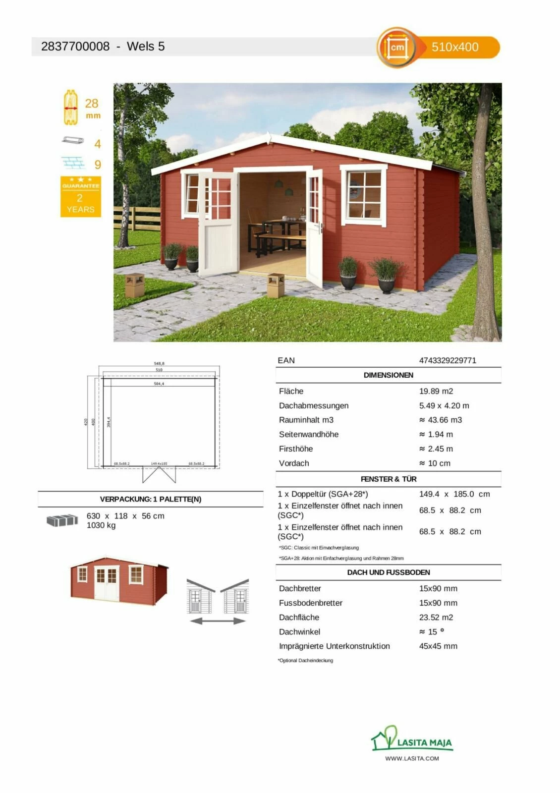 Das Gartenhaus WELS 5 ist der optimale Aufbewahrungsort für Ihre Gartengeräte, Fahrräder oder Werkzeuge. Das Gartenhaus wurde aus hochwertiger, nordischer Fichte produziert und der Fußboden sowie das Montagematerial sind im Lieferumfang inbegriffen.