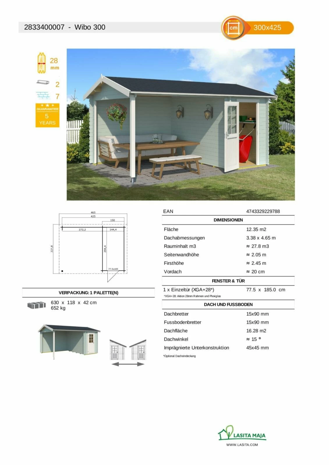 Gartenhaus WIBO – gletschergrün – Fichte massiv – 425/144×300 cm
